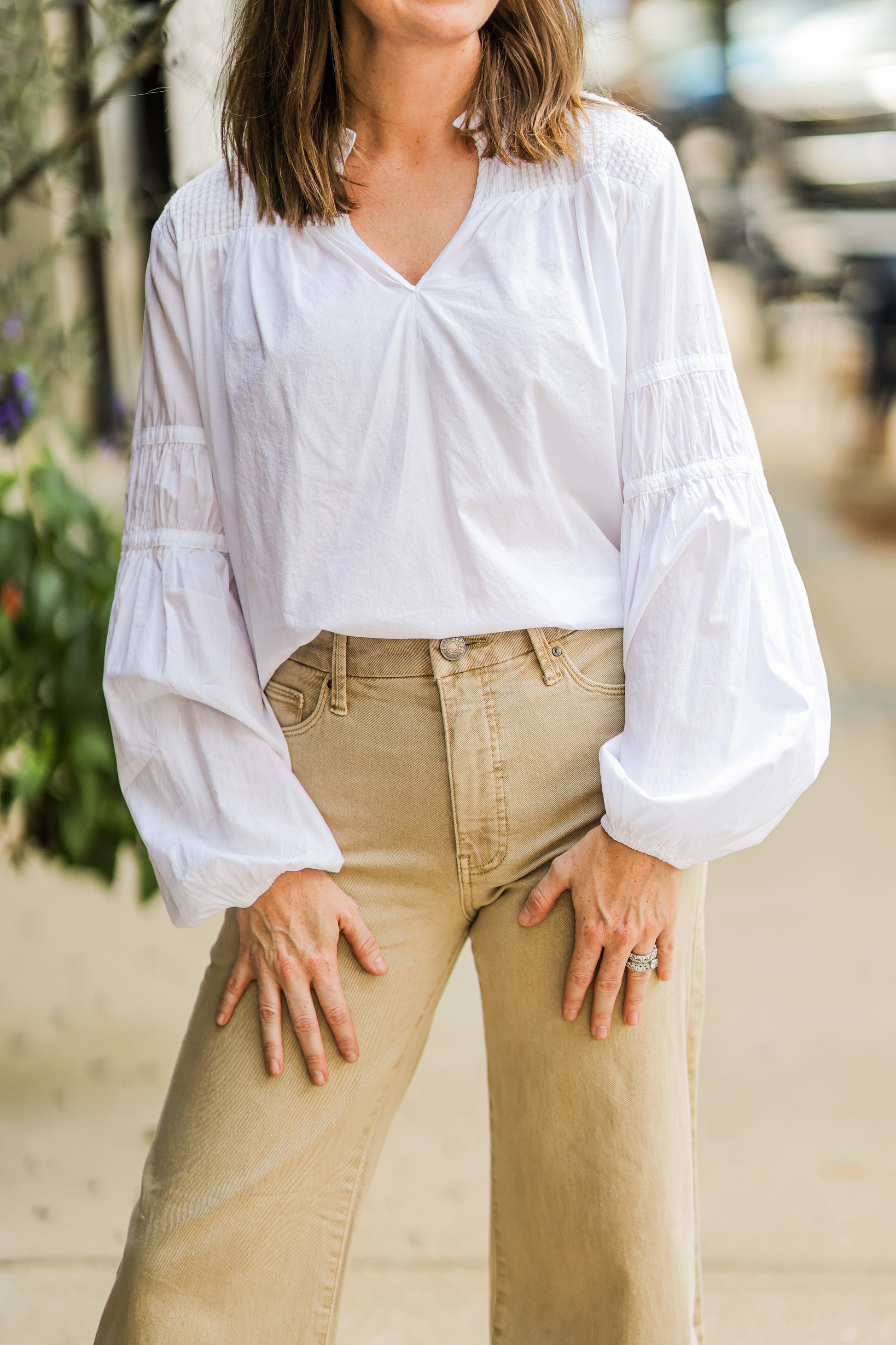 The Adagio White Cotton Top is the perfect go-to top! Made from soft, high-quality white cotton, this long sleeve top features gathered wrists and an open, collarless design for a modern and versatile look. Elevate your wardrobe with this must-have piece!
