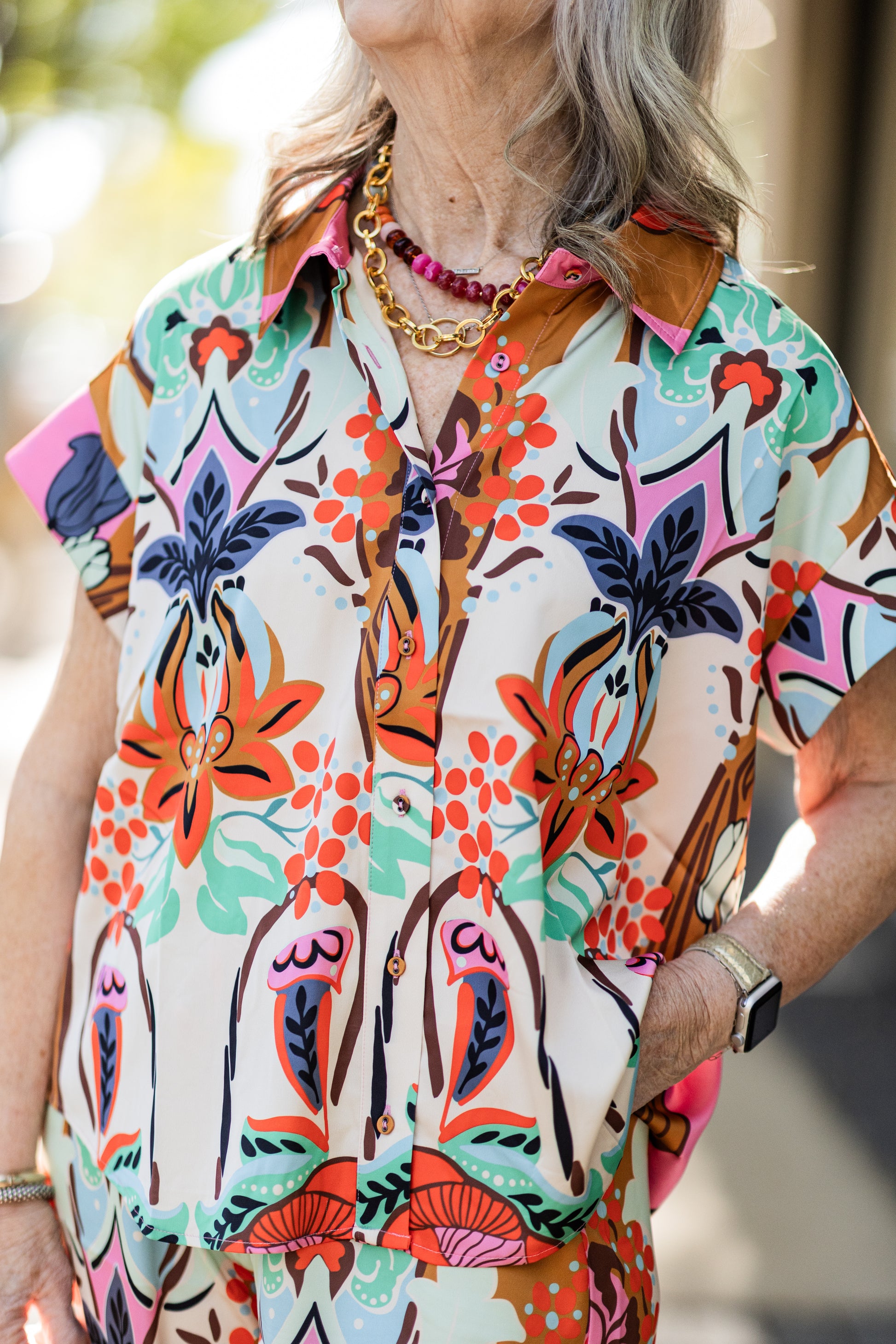 Wrap yourself in fall’s finest with the ALBIE ART NOUVEAU colar top. Its silky feel adds a touch of luxury, while the rich autumn colors bring warmth and style to your wardrobe. Perfect for elevating any look, this top blends comfort with a playful flair that’s ready to turn heads all season long.