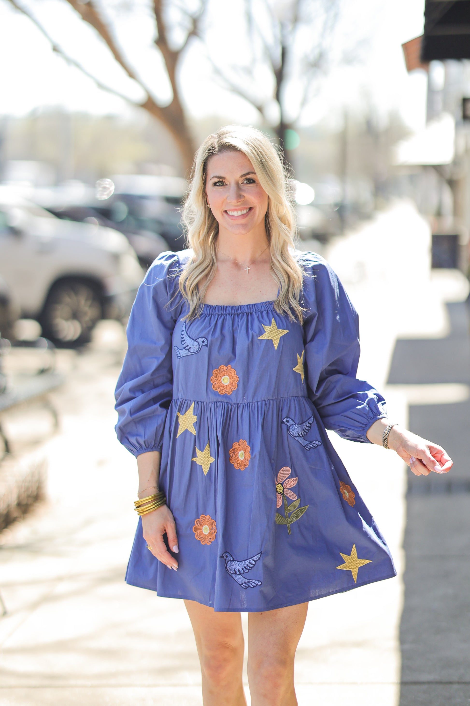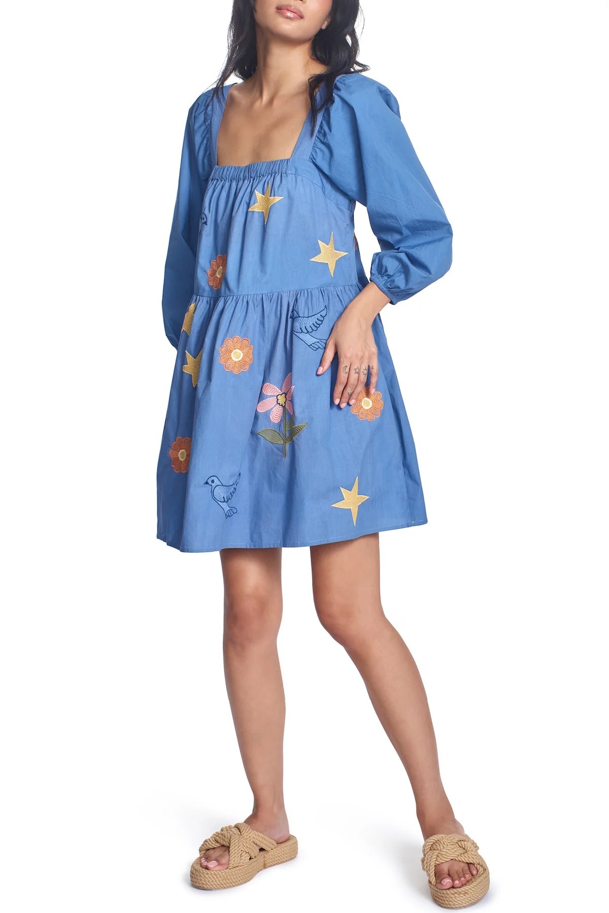 Indulge in the organic cotton Belladonna dress! With whimsical embroidery and a relaxed babydoll shape, this sky blue mini dress is a conversation starter. Convenient pockets add both practicality and charm. Wear with confidence and enjoy the compliments!