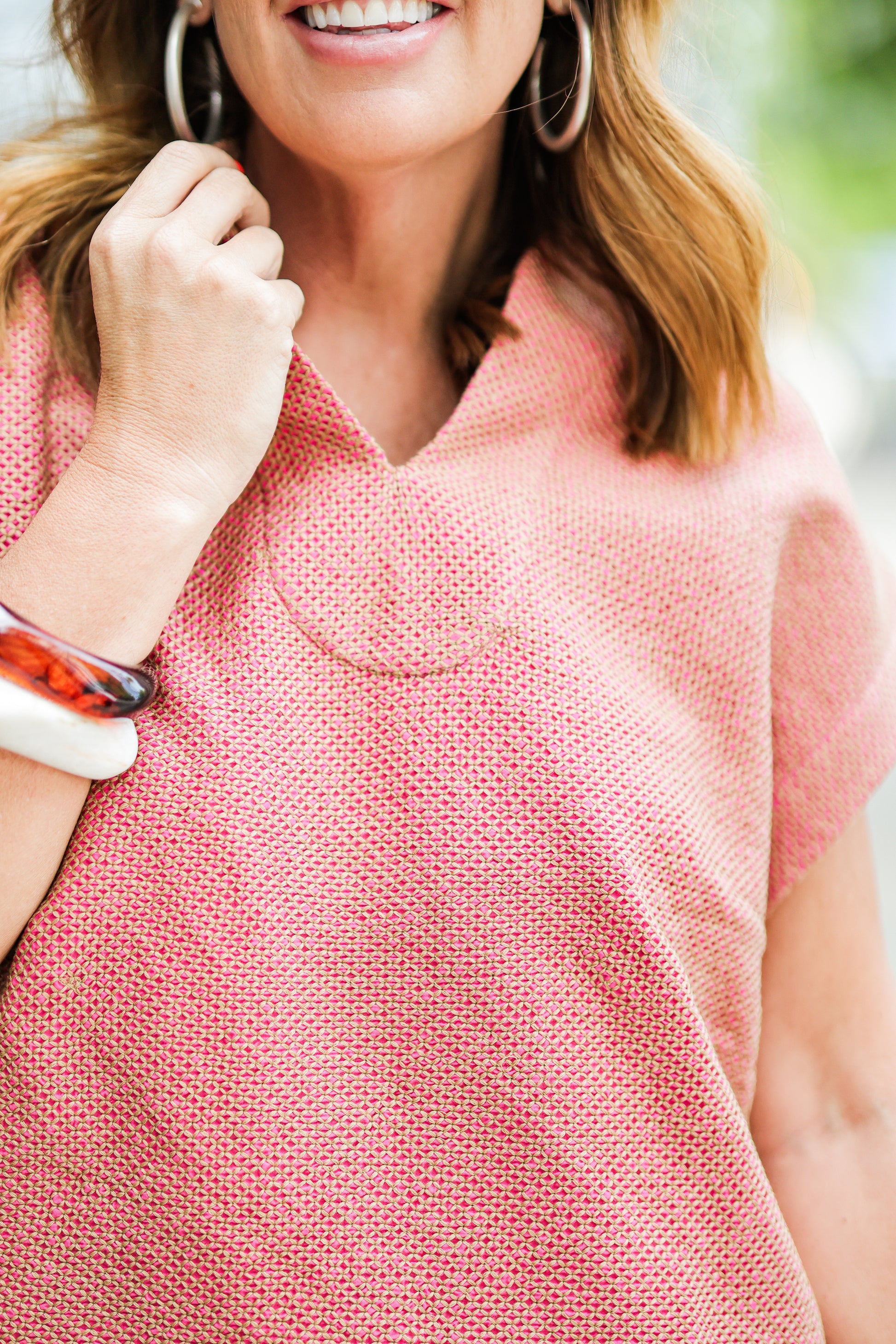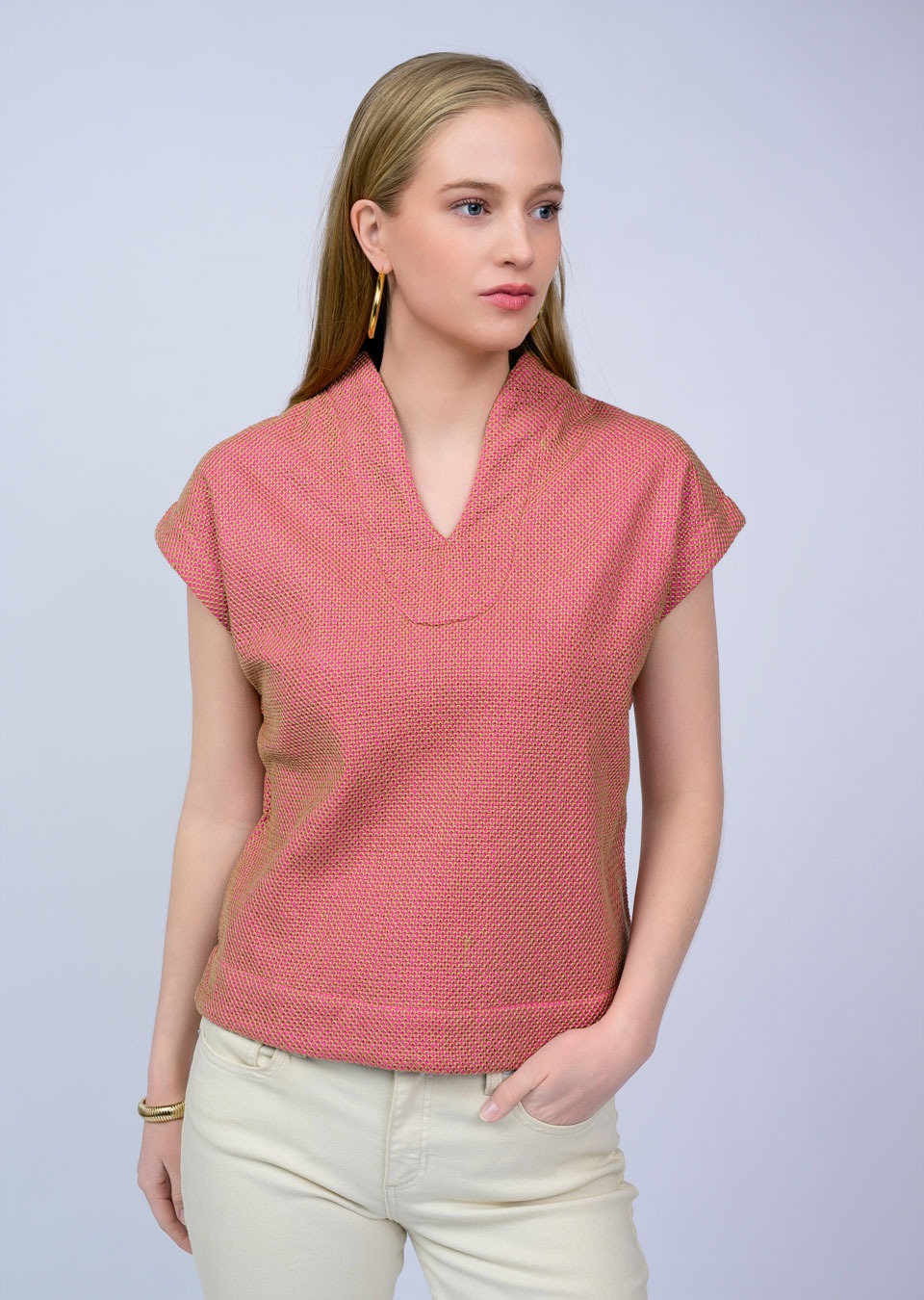 Elevate your wardrobe with the Berry Popover, featuring a structured silhouette in a captivating berry hue. Delicate gold stitching adds a refined touch, creating an illusion of polished professionalism. This top effortlessly blends elegance with a modern edge, perfect for making a sophisticated statement in any setting.