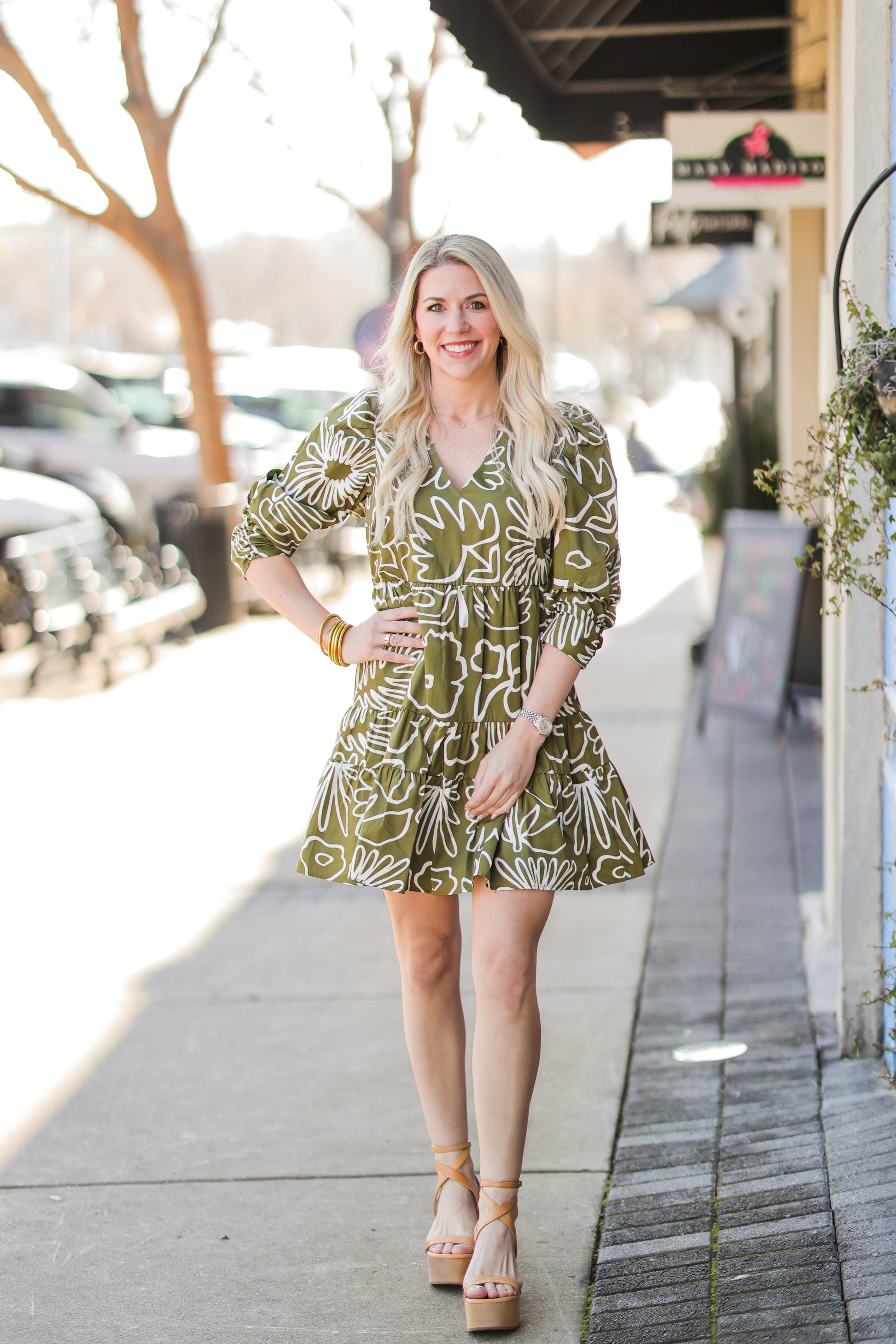 Introducing the BISSY DRESS IN FLORAL STUDIES - a perfect blend of elegance and simplicity. The olive and white floral pattern adds a touch of sophistication, while the V neck and great length make it suitable for all heights. Elevate your style with this exquisite mini dress.