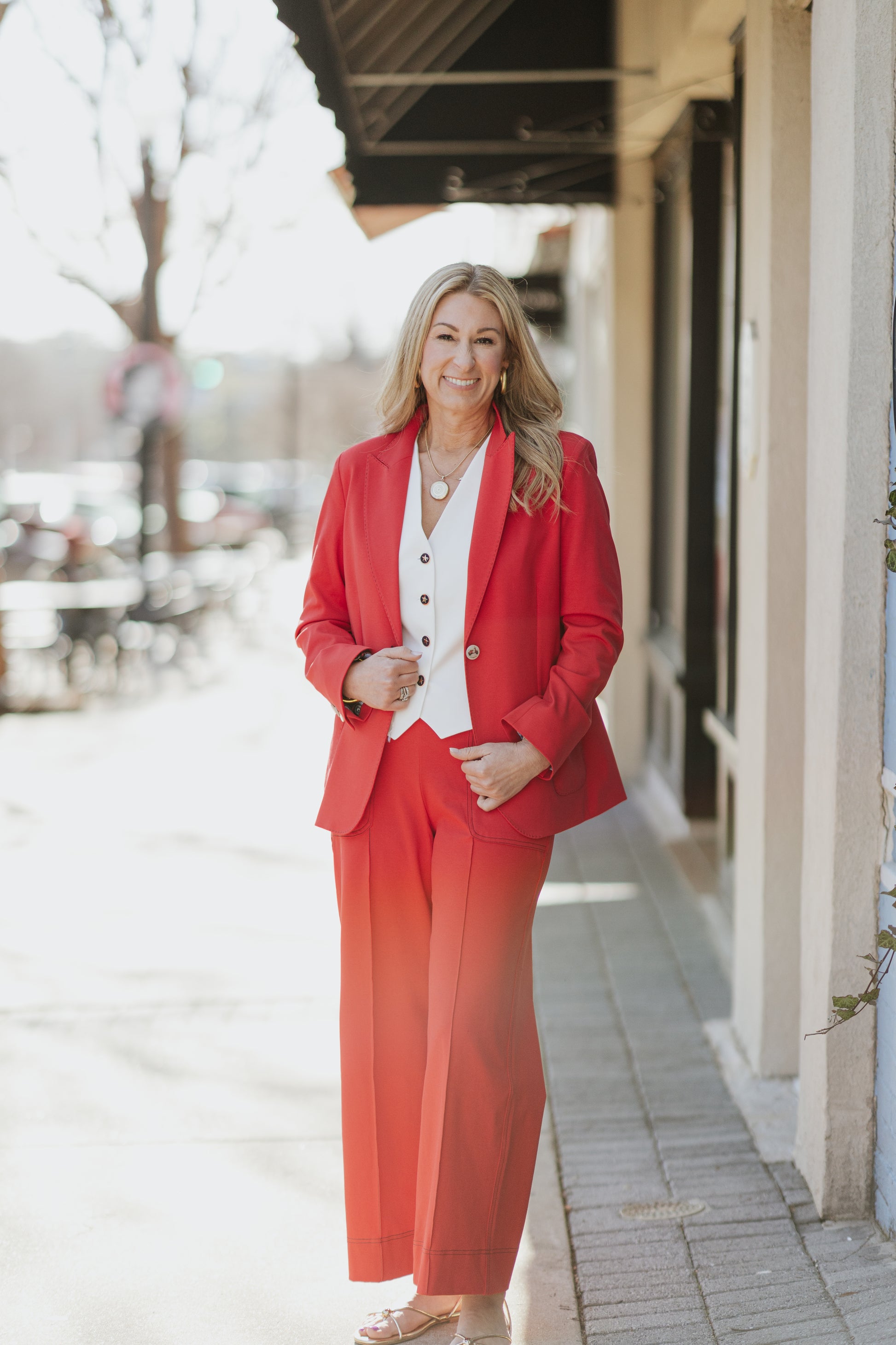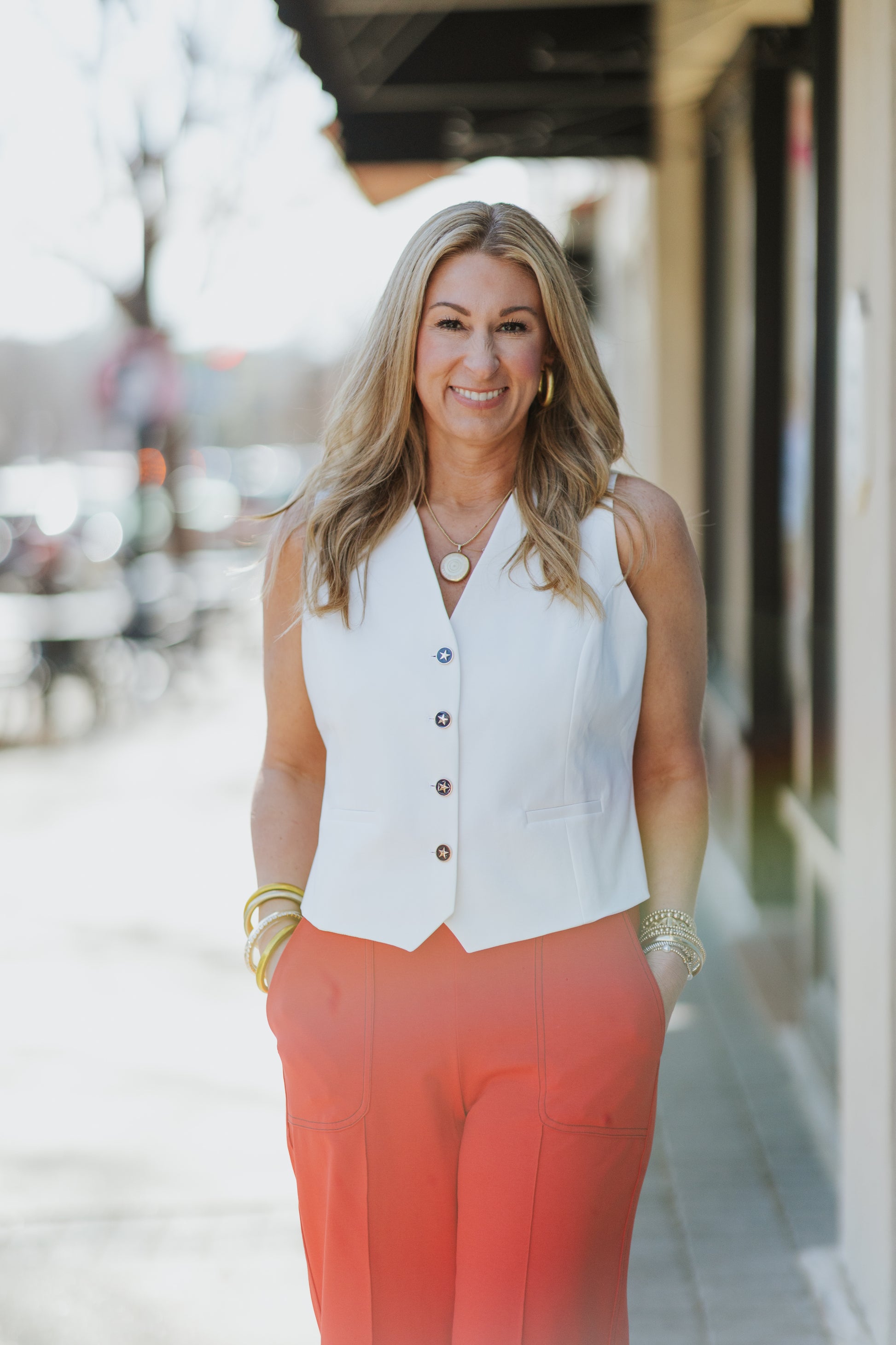 The perfect layering piece for warm-weather style, this white vest features a flattering V-neck and convenient button-front closure. Functional welt pockets keep essentials within reach, while the pointed hem adds a polished touch. Versatile and effortless, it's the summer essential that pairs with everything in your wardrobe.
