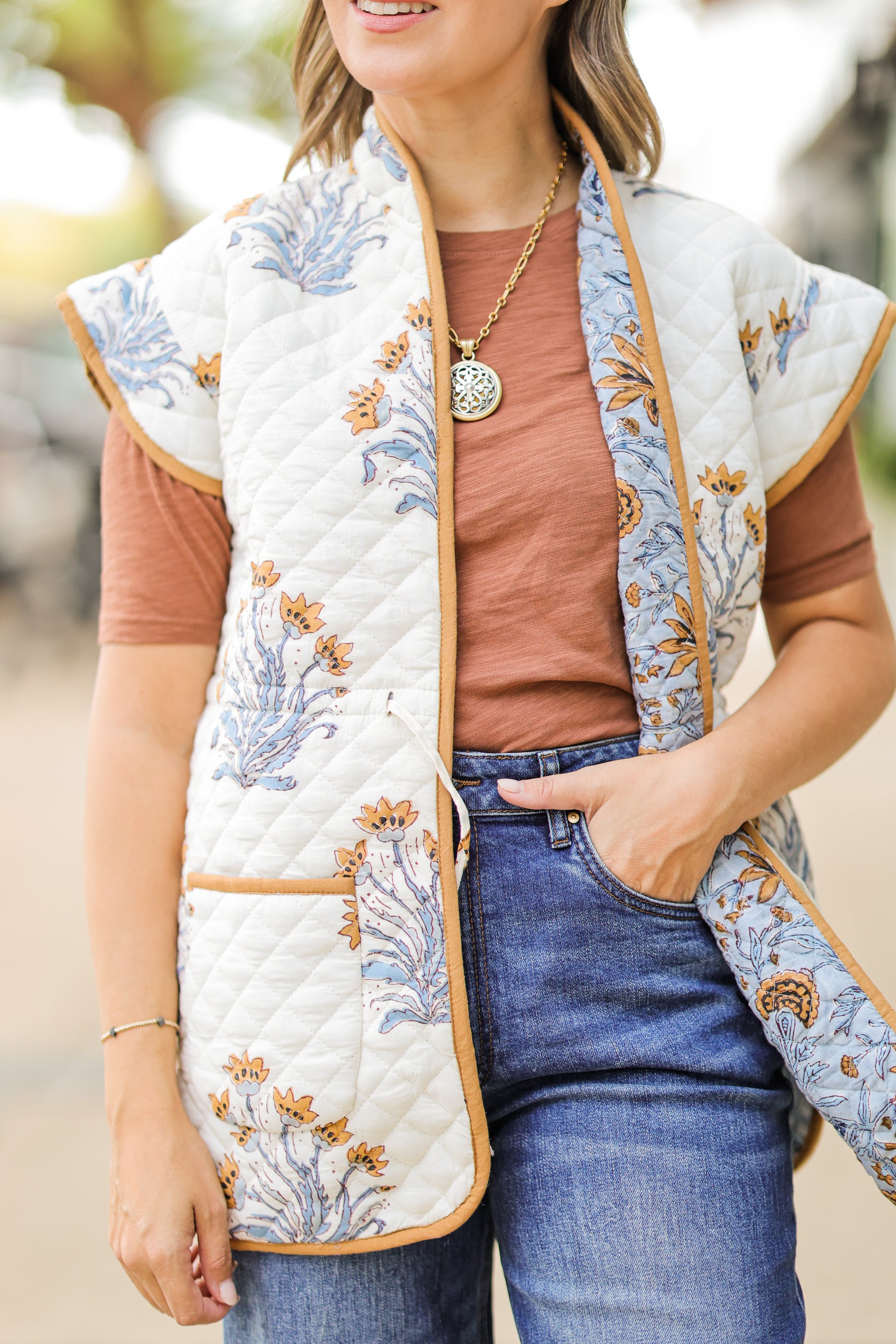 The Brynn Vest in Willow combines style and function with its short cap sleeves, mandarin collar, and adjustable drawstring waist for a tailored silhouette. Hand-blocked by skilled artisans in Jaipur, this quilted vest features contrasting piping and convenient front pockets, making it a chic and practical addition to your wardrobe. Perfect for layering, it offers both comfort and elegance in every wear.