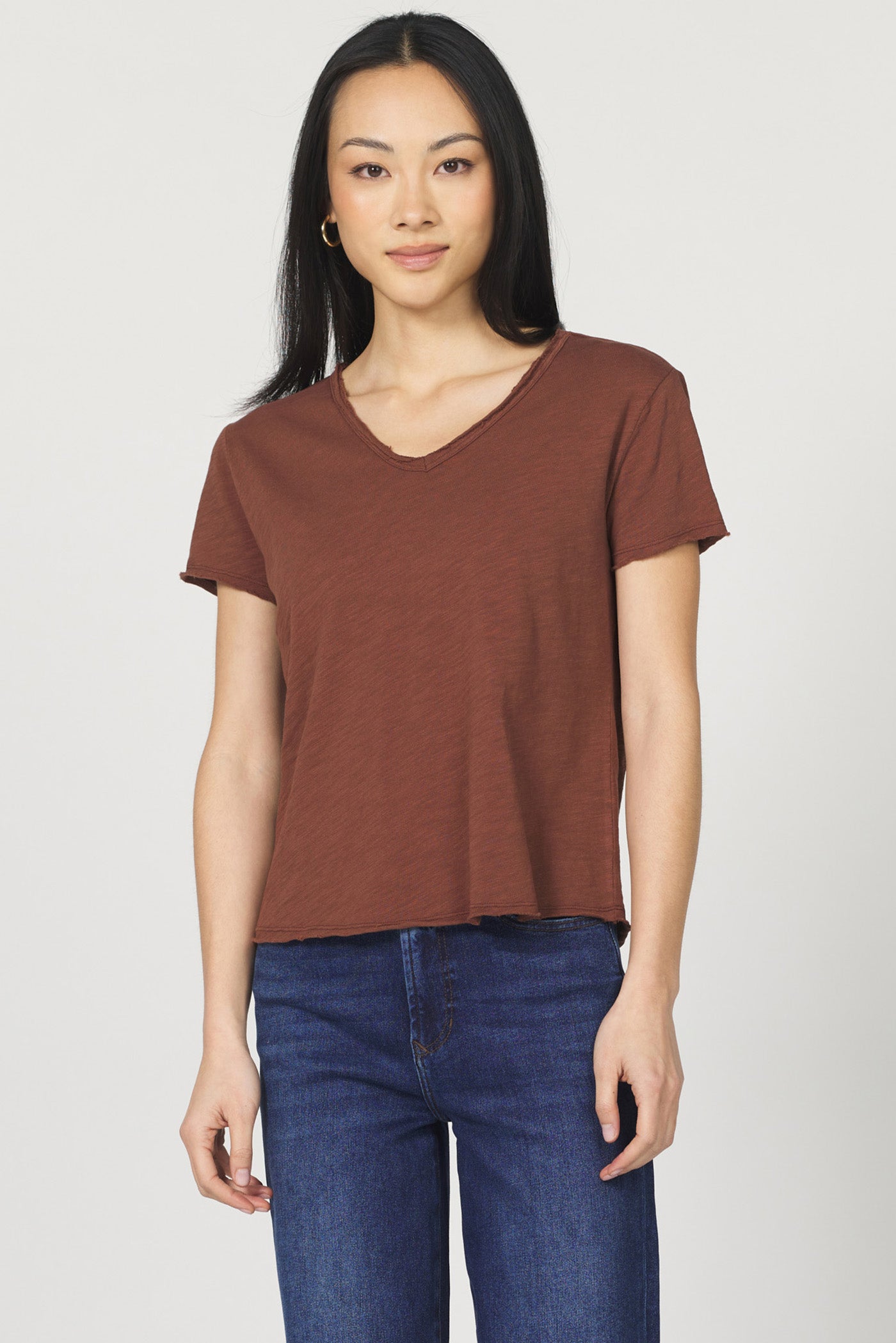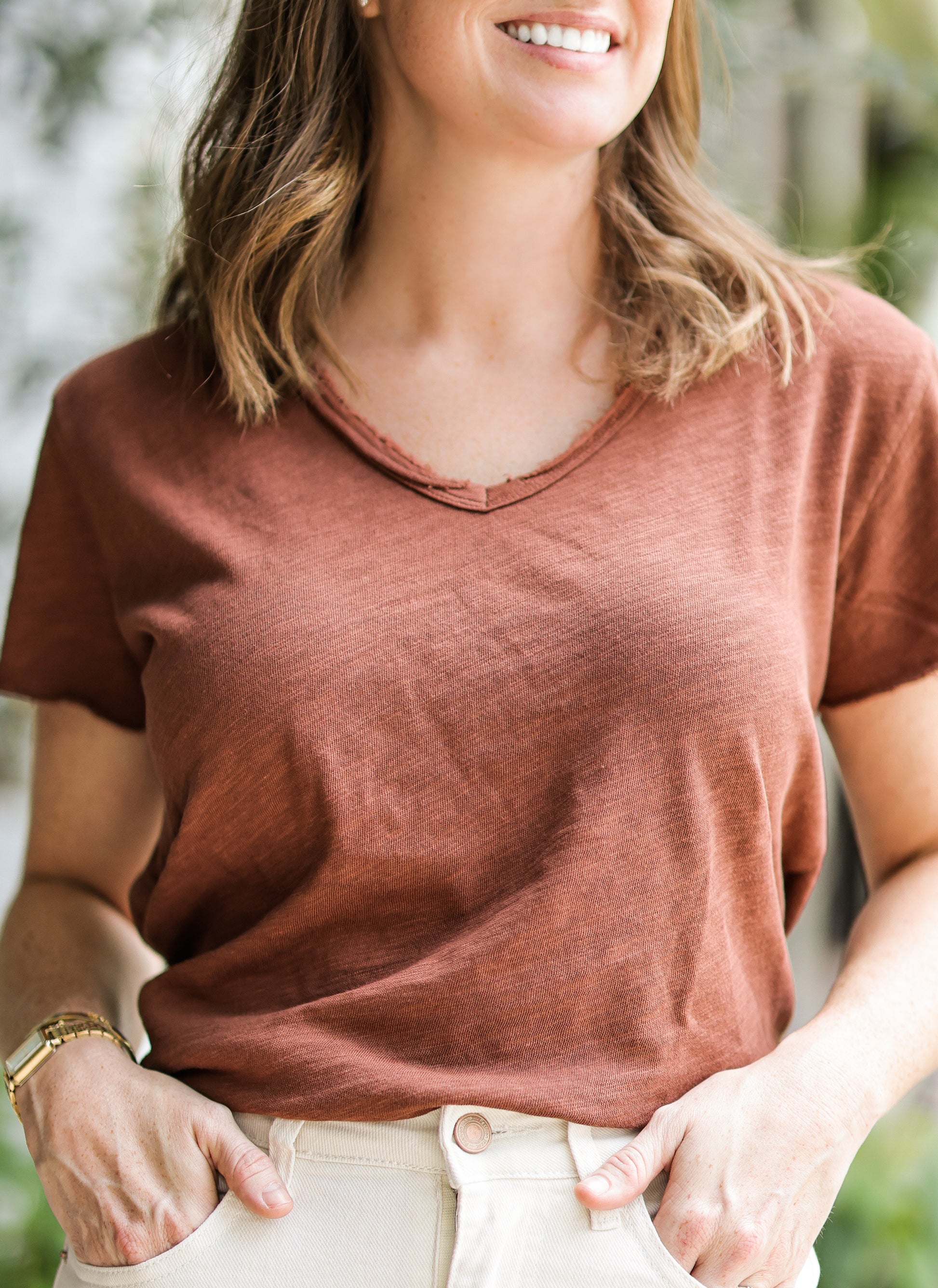 Embrace autumn with the Cappuccino Vanya Top, a best-selling V-neck cotton t-shirt in a warm, inviting shade. Its soft, breathable fabric ensures all-day comfort, making it perfect for layering or wearing on its own. This versatile top combines style and ease, supporting your wardrobe with a cozy, flattering fit for the season.
