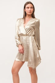 Get ready to turn heads with our CHIARA GOLD DRESS! With its luxurious wrap style and back zip, this dress is perfect for any holiday or New Year's event. The soft, airy feel will keep you comfortable all night long. Make a statement with this gold dress.