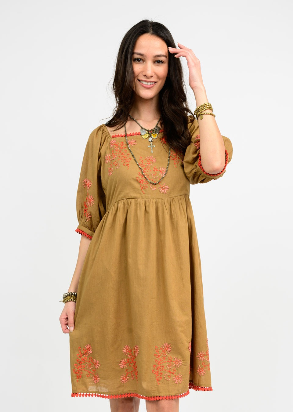 The Copper Bernice Dress features a lightweight cotton fabric in a warm copper hue, elegantly accented with subtle coral stitching. Designed for effortless transition from summer to fall, this dress offers both comfort and refined style, making it an essential piece for a sophisticated wardrobe.