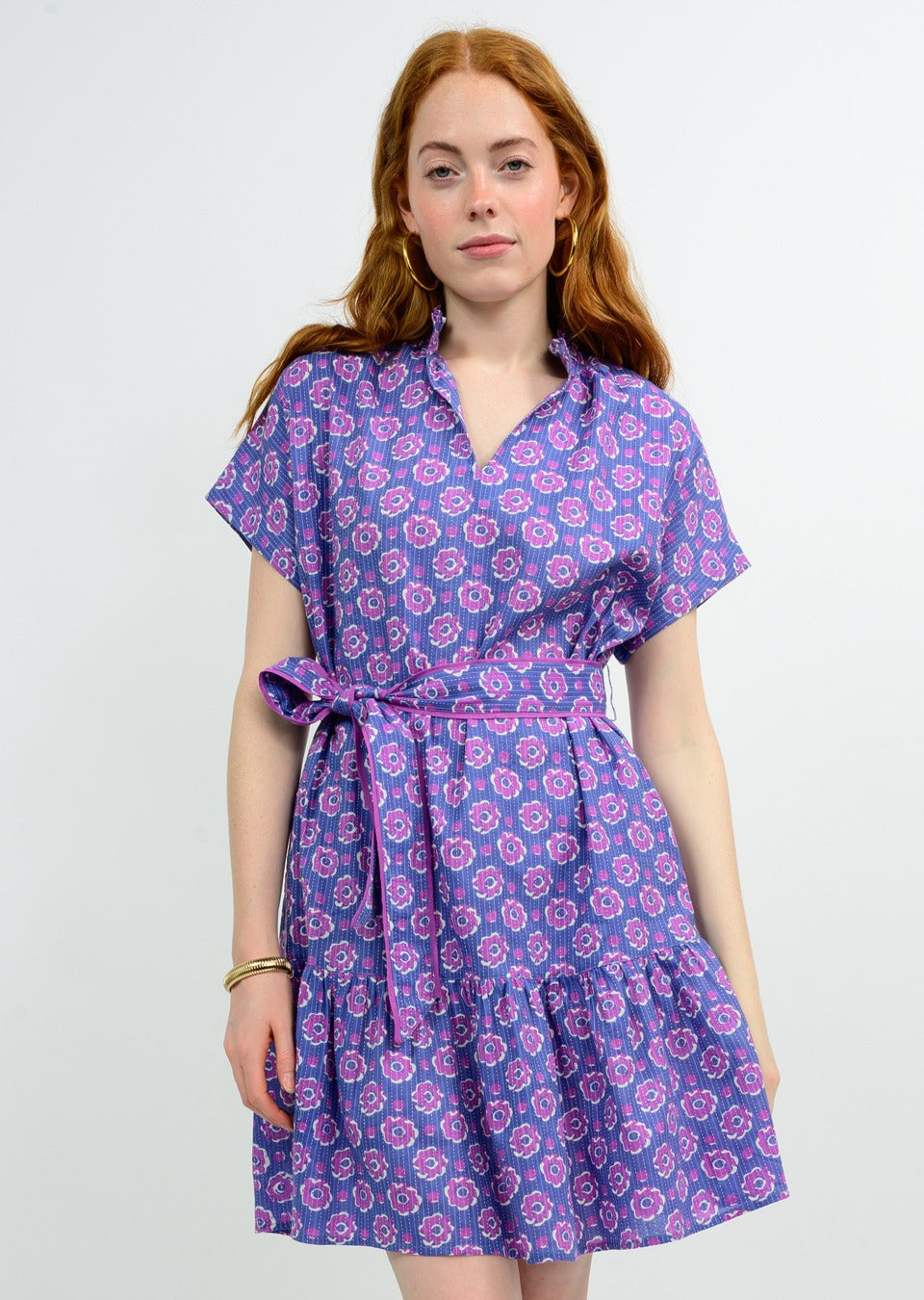 Expertly crafted from the finest cotton, our DALLAS PURPLE DRESS is a must-have for any fashion-forward individual. The belted shift design accentuates your figure, while the tiered bottom and collar popover add a touch of elegance. Its stunning purple hue with a fuchsia pink trim will surely make a statement at any event.