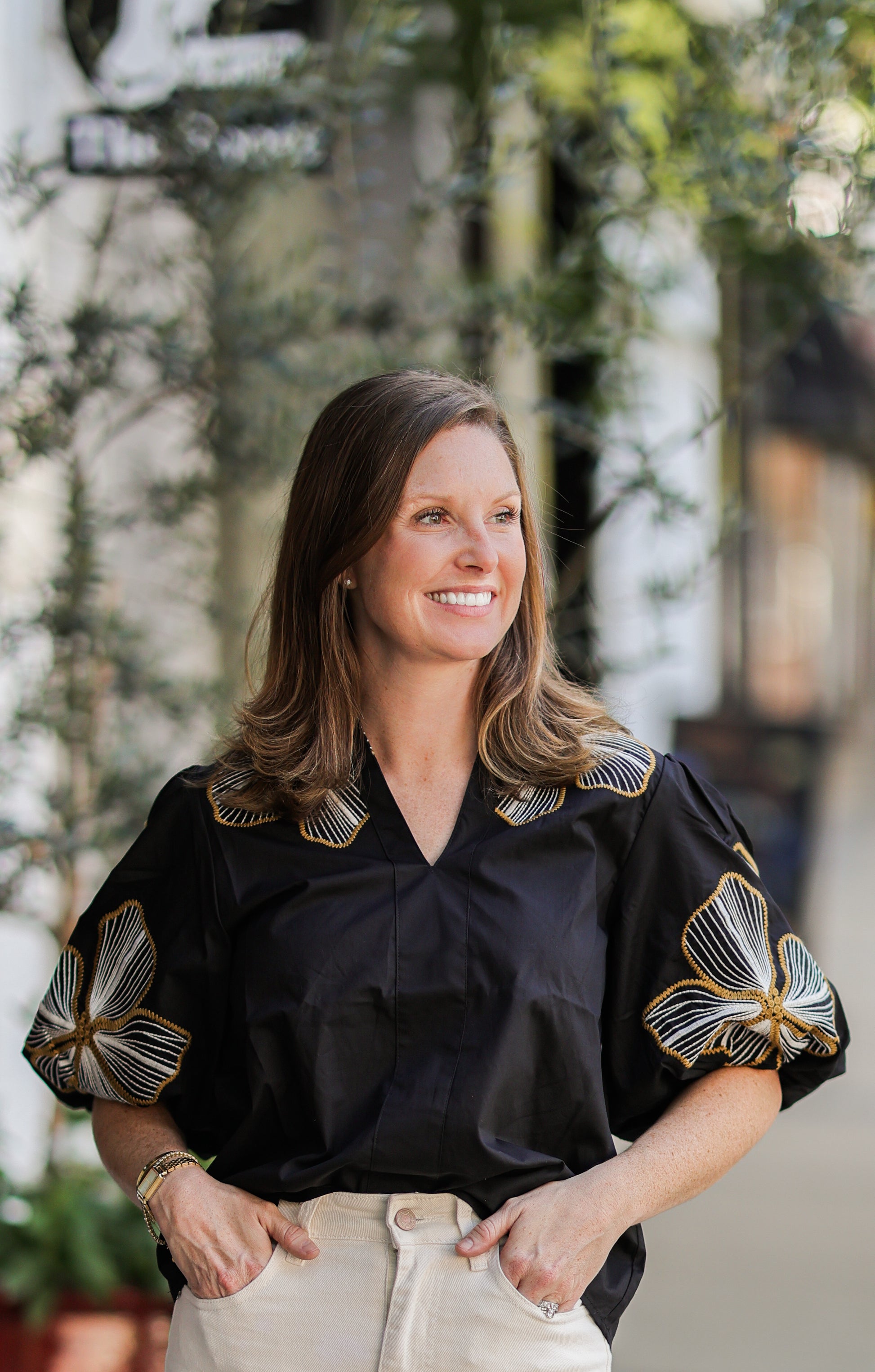 The Ebony Flower Top brings a playful twist to your wardrobe with its timeless puff sleeves and charming brown stitching detail. Crafted from soft black fabric, this favorite brand piece combines classic style with a fun edge you'll love wearing again and again. Perfect for adding a touch of personality to any outfit!