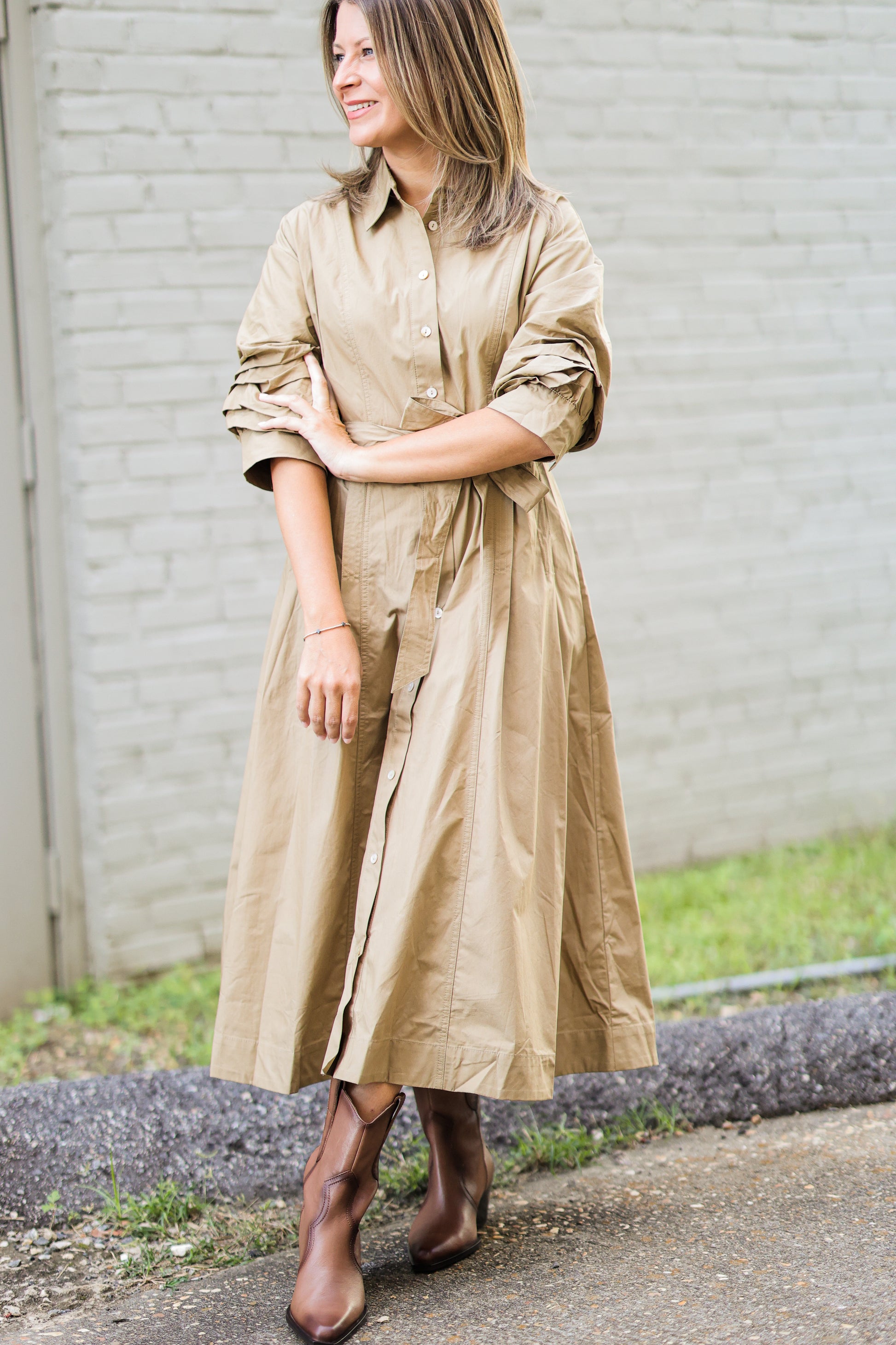 This stylish button-down dress features a classic basic collar and elegant pleated, tucked sleeves for a refined look. Designed with convenient side pockets and a self-tie waist, it offers both functionality and a flattering silhouette. Perfect for elevating your everyday wardrobe with effortless charm.