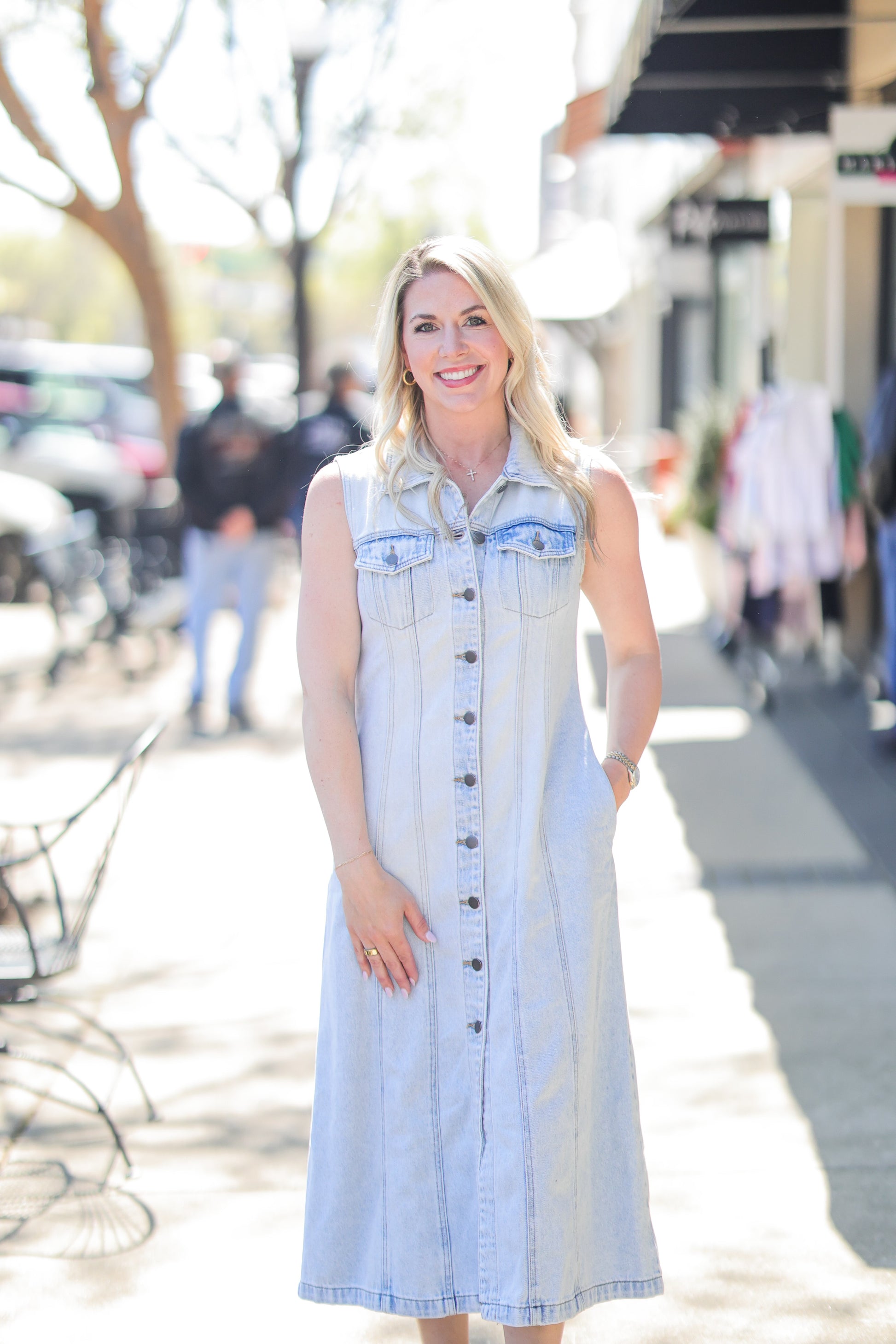 Get ready for the spring and summer with our Gretel Sleeveless Dress! Made from 100% cotton denim, this dress features a button-down front, light wash, and stretch collared perfect for warm weather. With a high point of 48 inches from the shoulder, this dress is sure to flatter every body type.