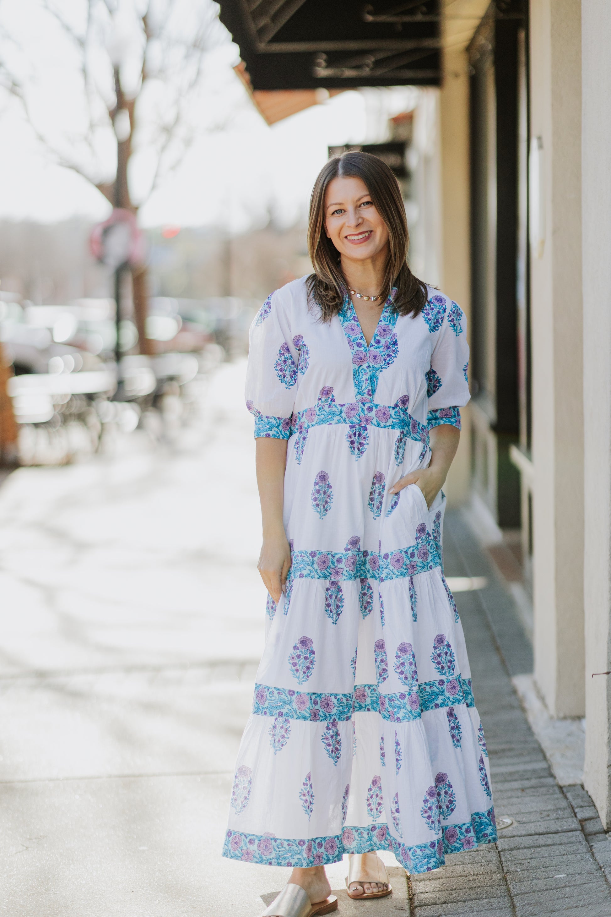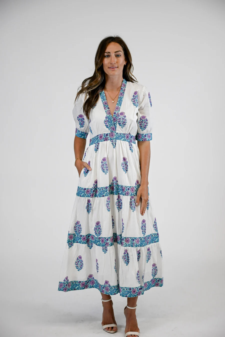 The Hazel Dress brings together timeless style and everyday comfort. This cotton maxi features a flattering V-neckline with hook-and-eye closure, half-length sleeves with tailored cuffs, and a graceful tiered skirt. Contrast trim details add sophistication, while the side invisible zipper and functional pockets make it practical for any occasion. Hand-crafted by artisans in Jaipur, India using 100% cotton with lining for a polished, refined look.