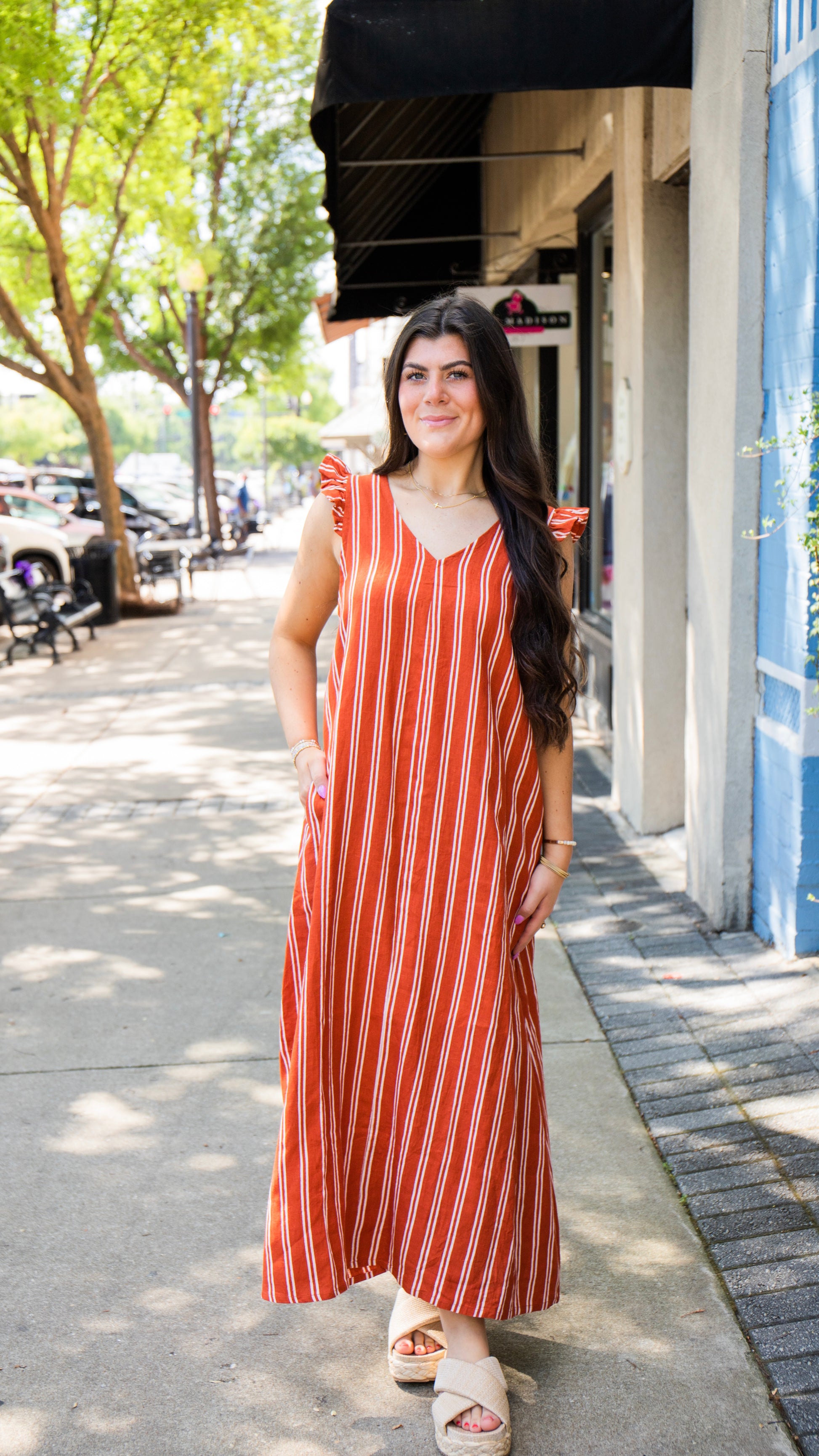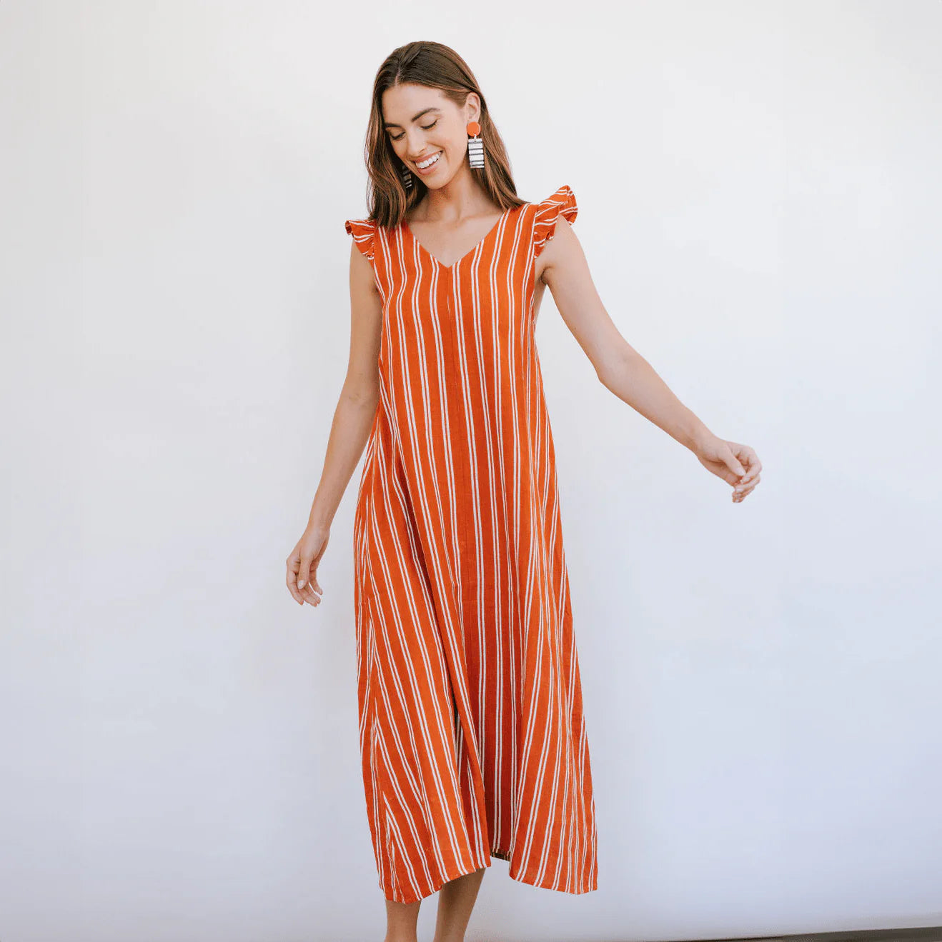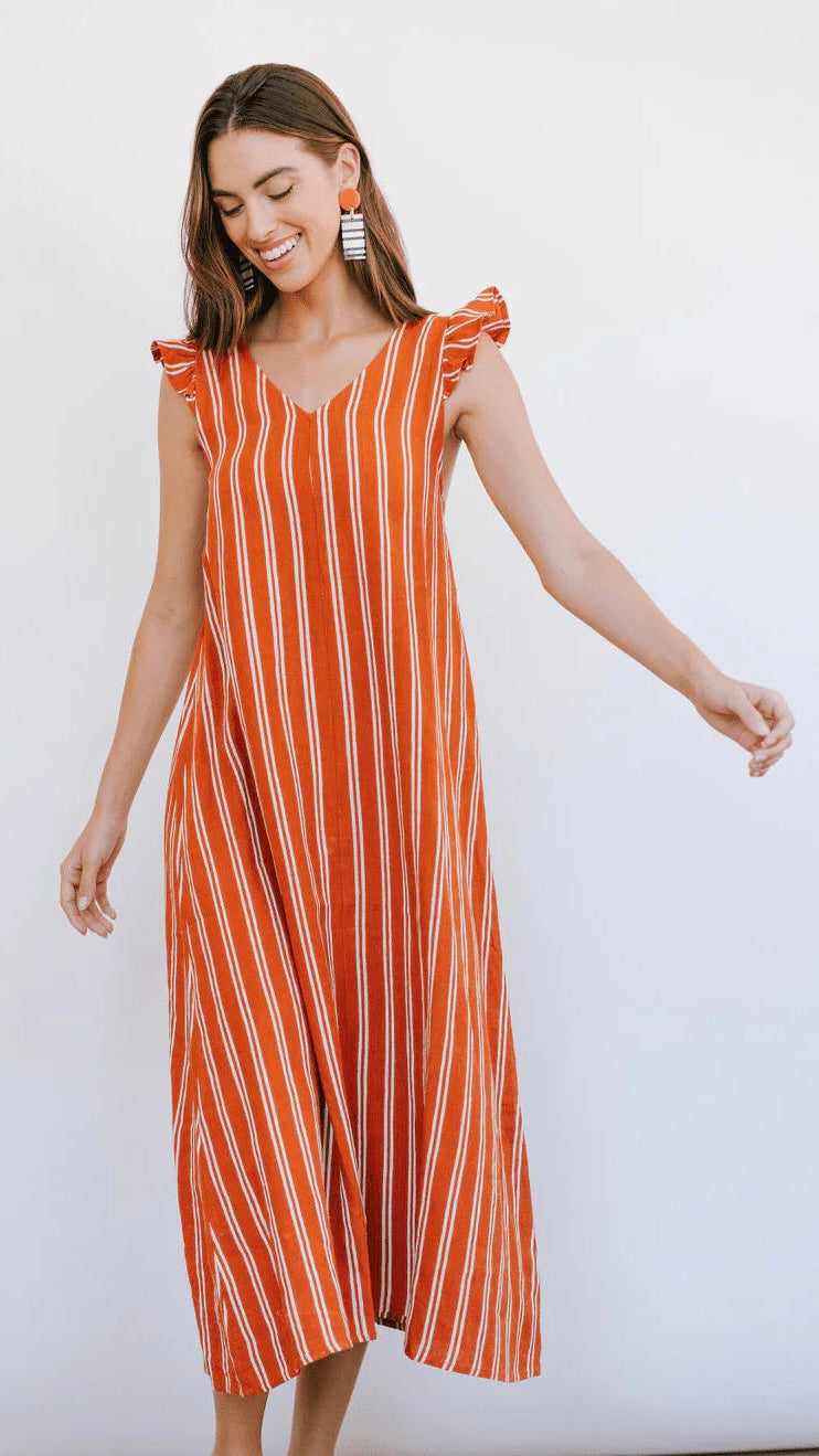 A burnt orange linen beauty. The flattering and feminine Hemingway Sofia dress is made with 100% linen. Complete with ruffle detailed sleeves and an open back with a slight elastic stretch, making for an extra comfortable fit. Extra bonus: she has pockets!