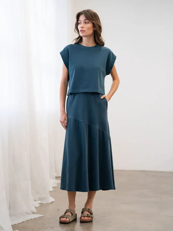 The HIT THE ROAD SET is designed to support your lifestyle, whether you're traveling or staying close to home. This thoughtfully crafted ensemble features a sleeveless tank with a crew neckline and clean binding finish, extended shoulders for comfortable movement, and a cropped length that works beautifully with high-rise bottoms. The soft midweight knit provides gentle support for everyday wear, while raw edge hems add modern texture. In a versatile dream blue, it pairs seamlessly with the matching skirt to create a coordinated, confidence-boosting look you'll reach for again and again.