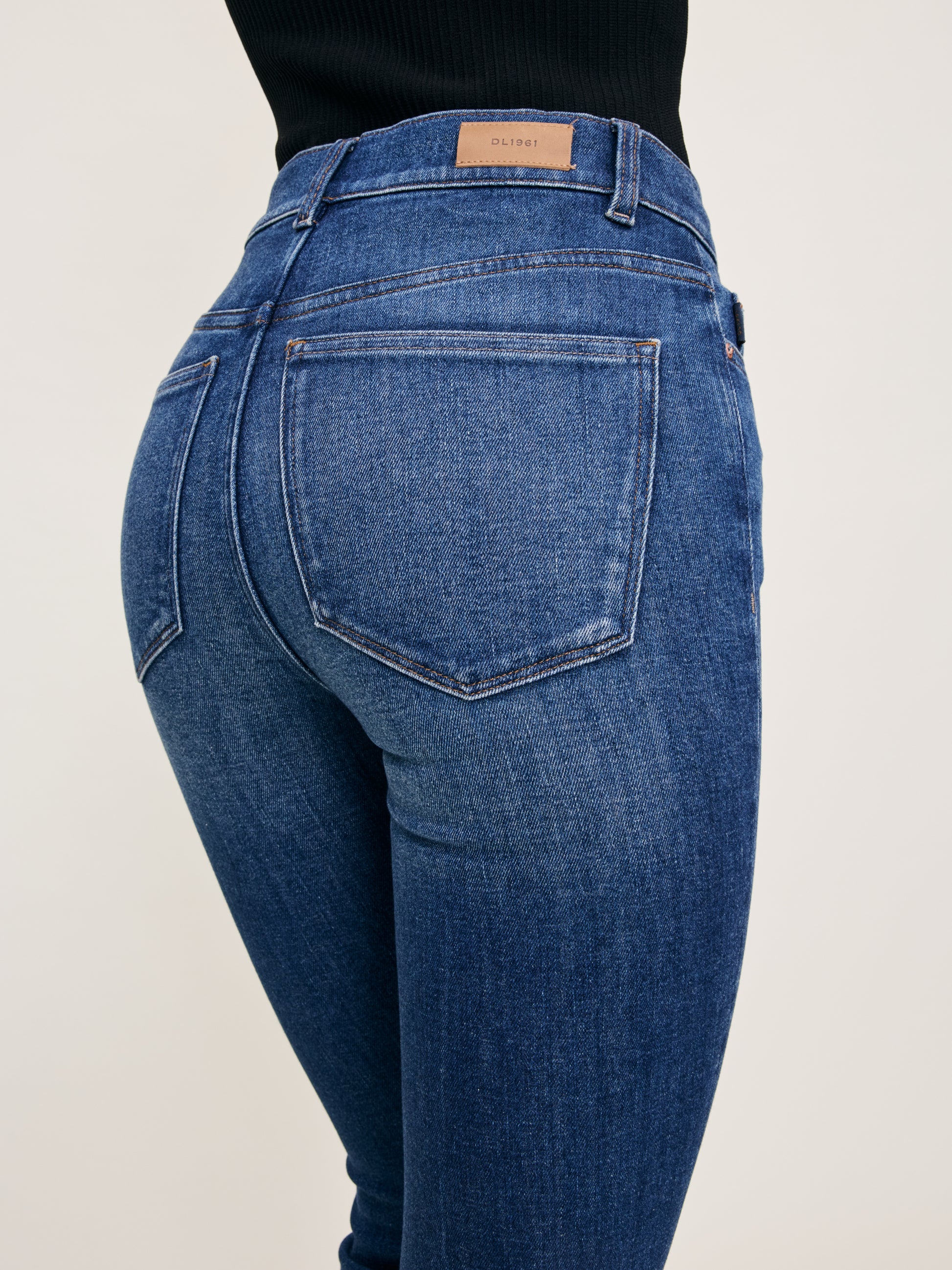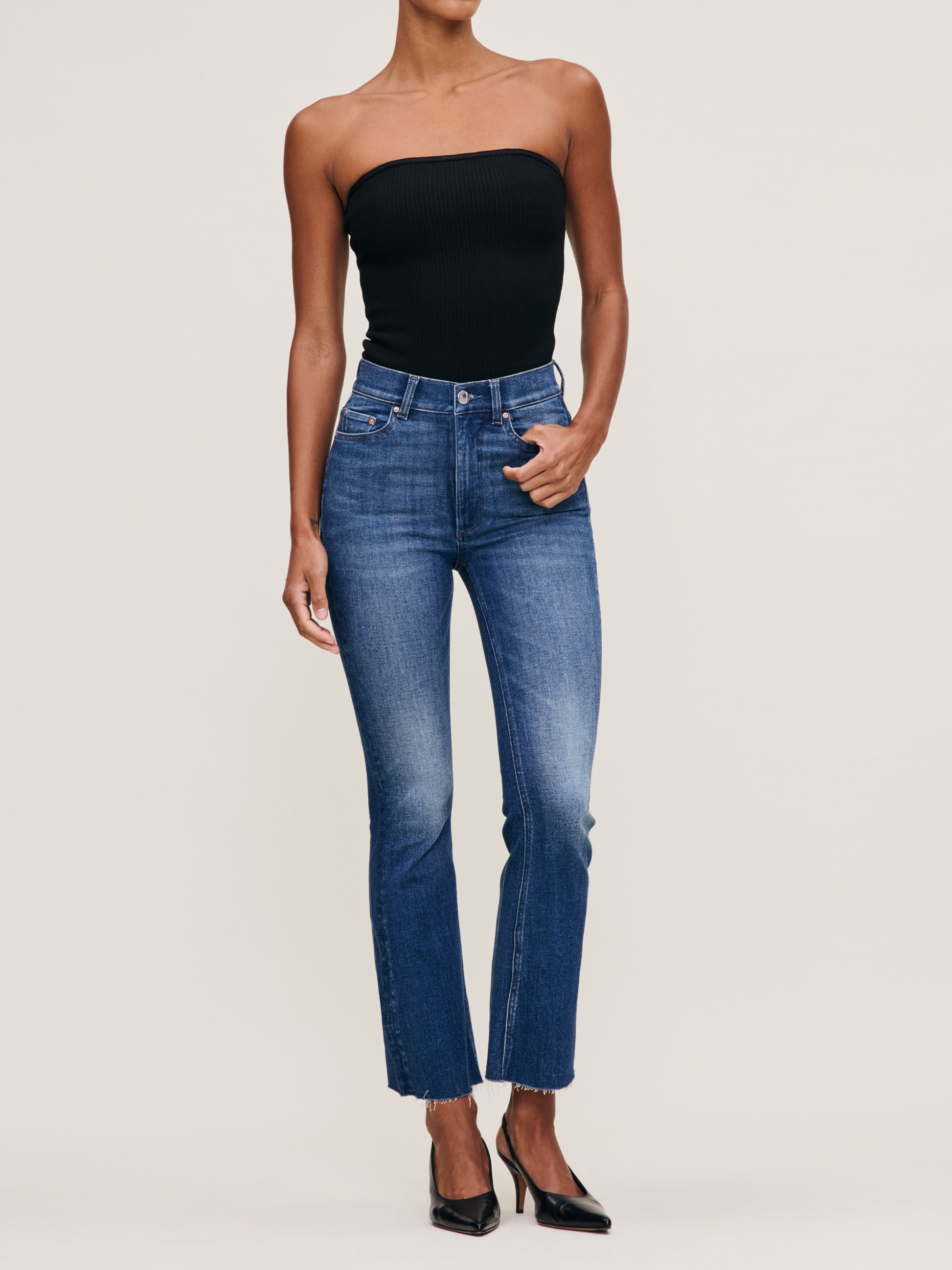 Bridget is a high-rise, cropped boot cut fit that utilizes our Instasculpt™ technology to smooth, sculpt, and conform to your body for the perfect fit. Hulton is a mid-indigo wash with subtle fading and whiskering for a worn in look. It features a shiny silver shank, matte copper rivets, multi-colored stitching, raw hem, and a brown back patch. WILL SELL OUT FAST