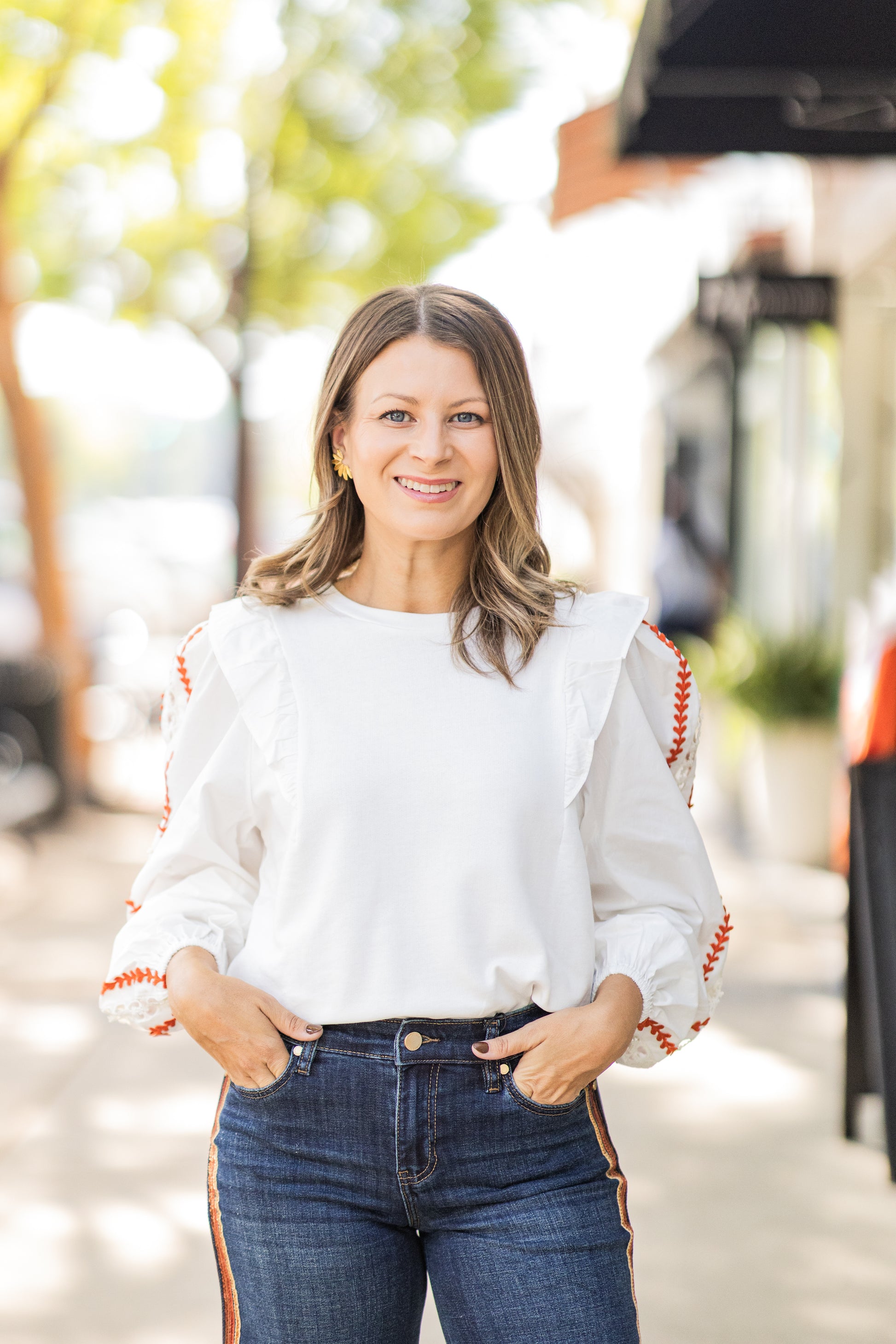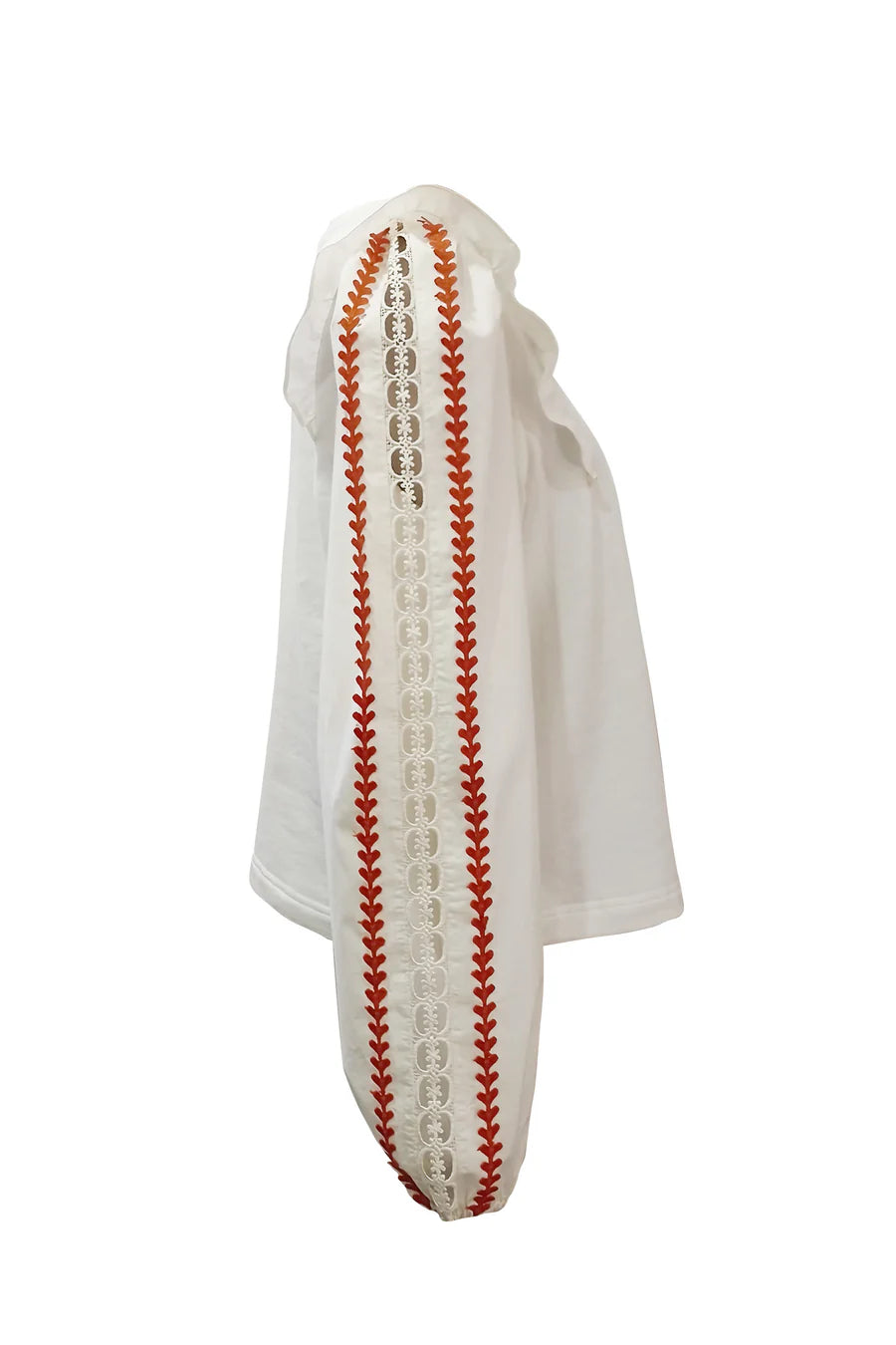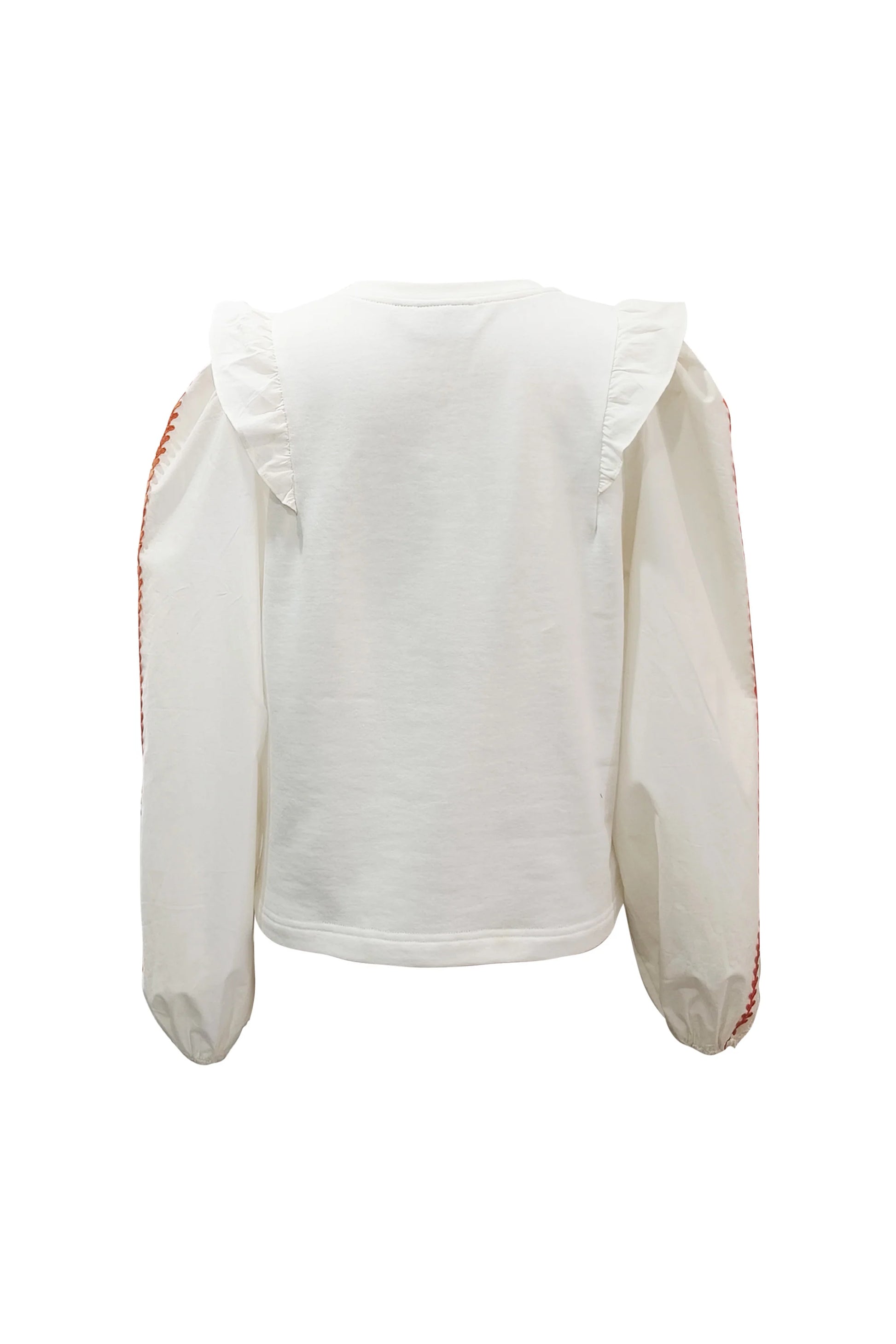 The Kacey by Emily Lovelock sweatshirt in Ivory combines cozy softness with delightful details. Crafted from a comfy cotton-blend, it features charming ruffled shoulders and bold balloon sleeves accented with ladder lace and embroidered trim. Elastic cuffs give the sleeves a playful, blouson shape. Perfect for pairing with jeans or dressing up with skirts or trousers, this sweatshirt adds fun flair to any casual look.
