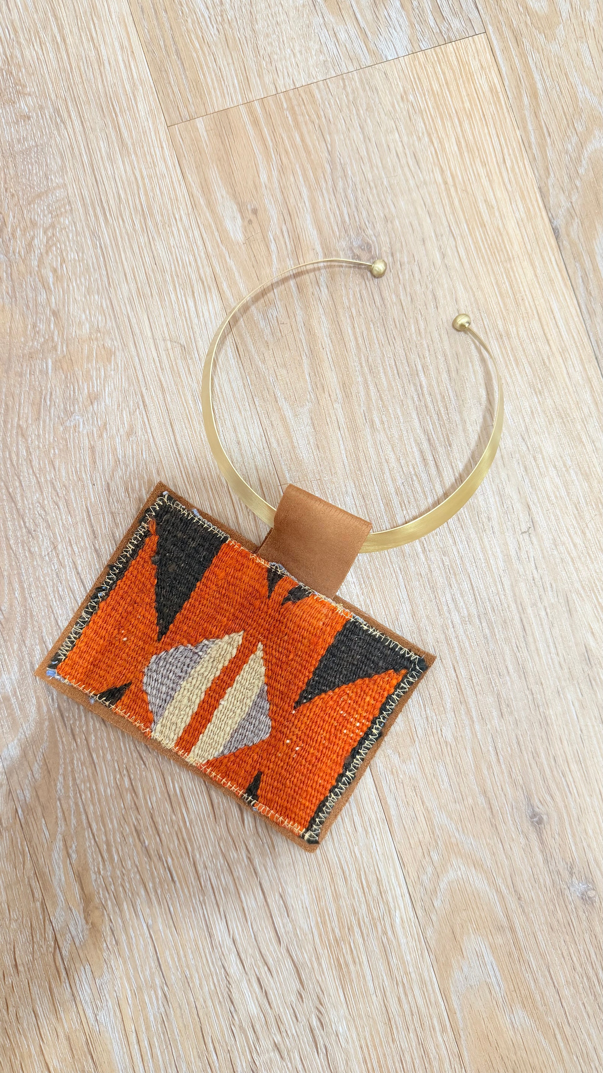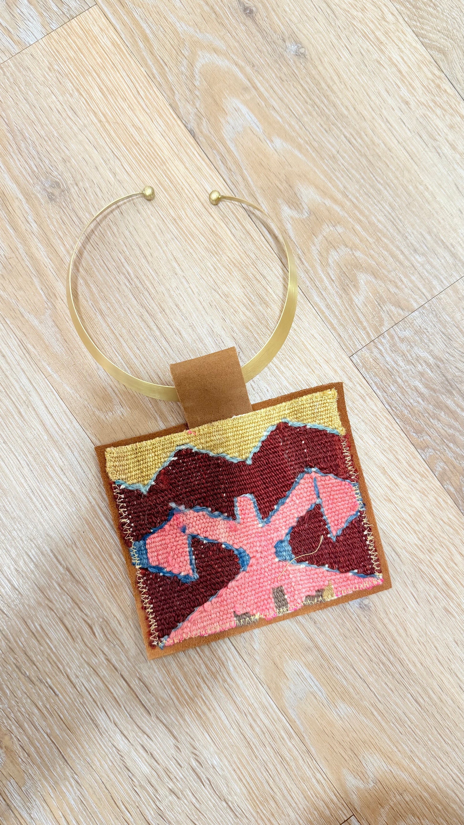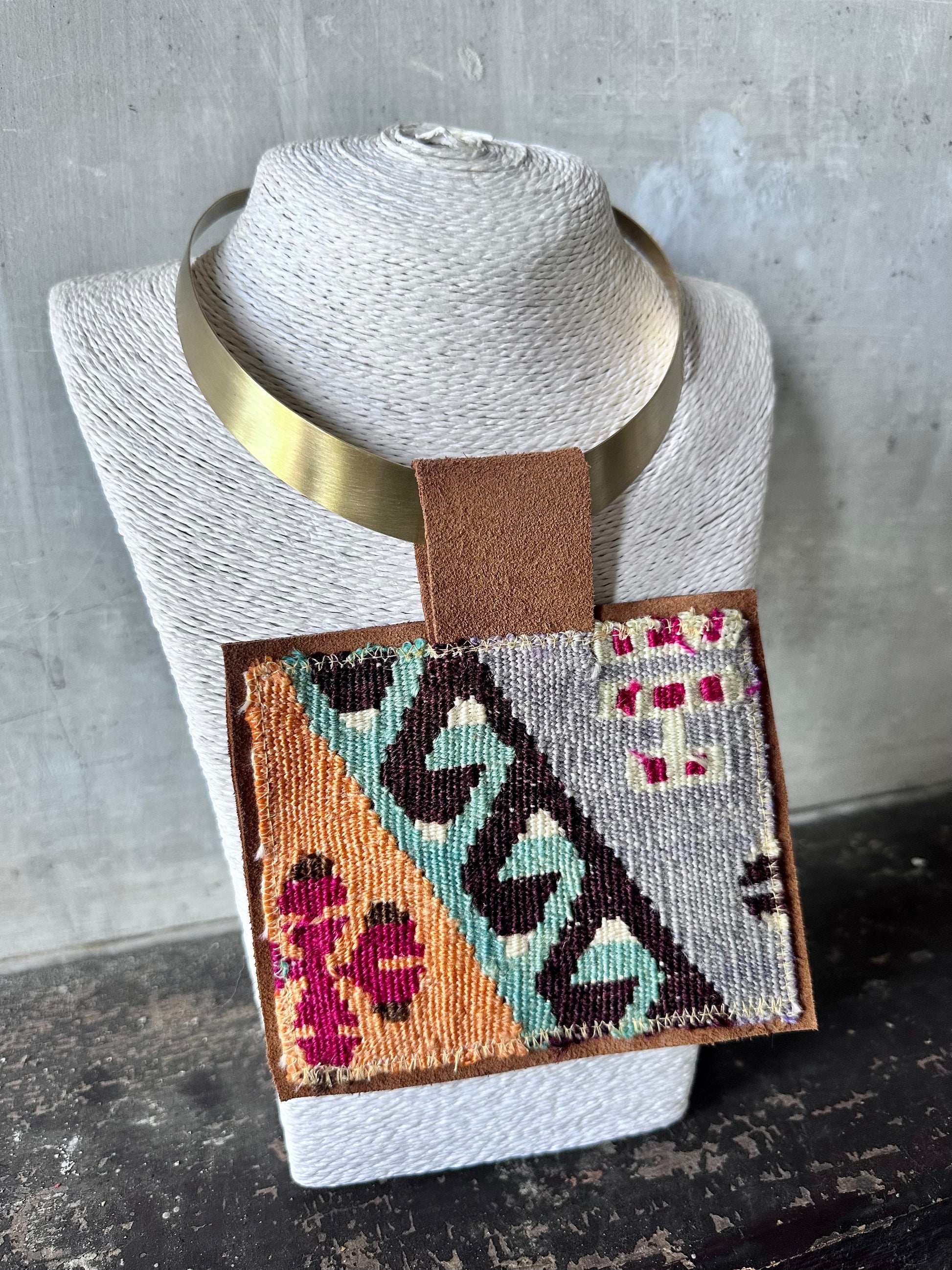 Discover the unique charm of our KILM NECKLACE, crafted from authentic vintage Turkish kilim textiles and backed with soft suede for comfort. Each pendant is a bold statement piece, stitched carefully to preserve the fabric’s character while minimizing fraying. Choose your perfect neckpiece style—slim gold, chunky brass, acrylic, or rope—to match your look. Embrace the natural color variations and slight imperfections that make every necklace truly one-of-a-kind. Please note, due to the artisanal process, all sales are final. Elevate your style with a piece that tells a story.