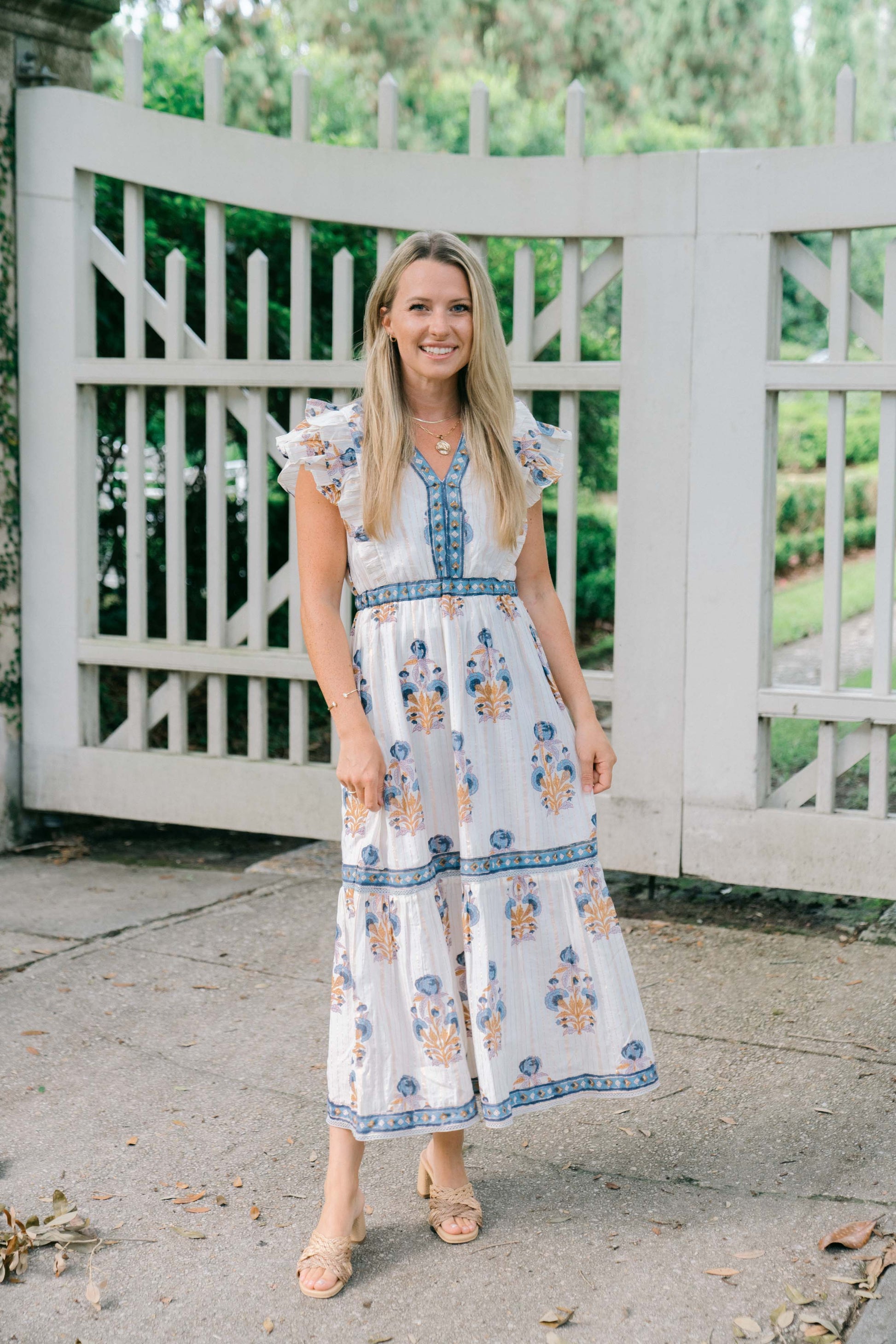 The Kira Peony Harvest dress combines elegant design with artisanal craftsmanship. Featuring a flattering v-neckline, an elastic waistband for comfort, and delicate short flutter sleeves, it offers both style and ease. The contrasting trim on the neckline and skirt adds a refined touch. Hand-blocked by skilled artisans in Jaipur, India, this 100% cotton lurex garment is fully lined for a smooth, comfortable fit. Perfect for those who appreciate unique, handcrafted fashion with a modern silhouette.