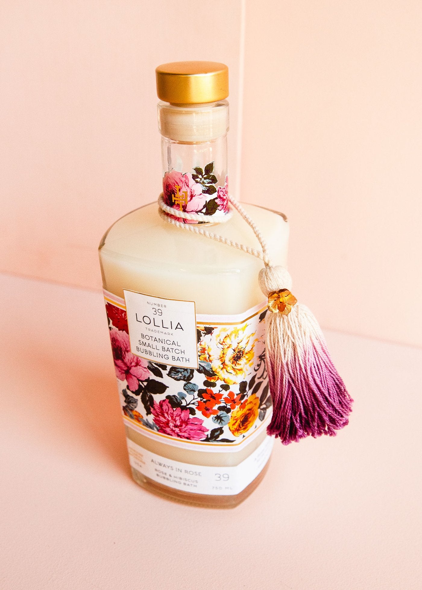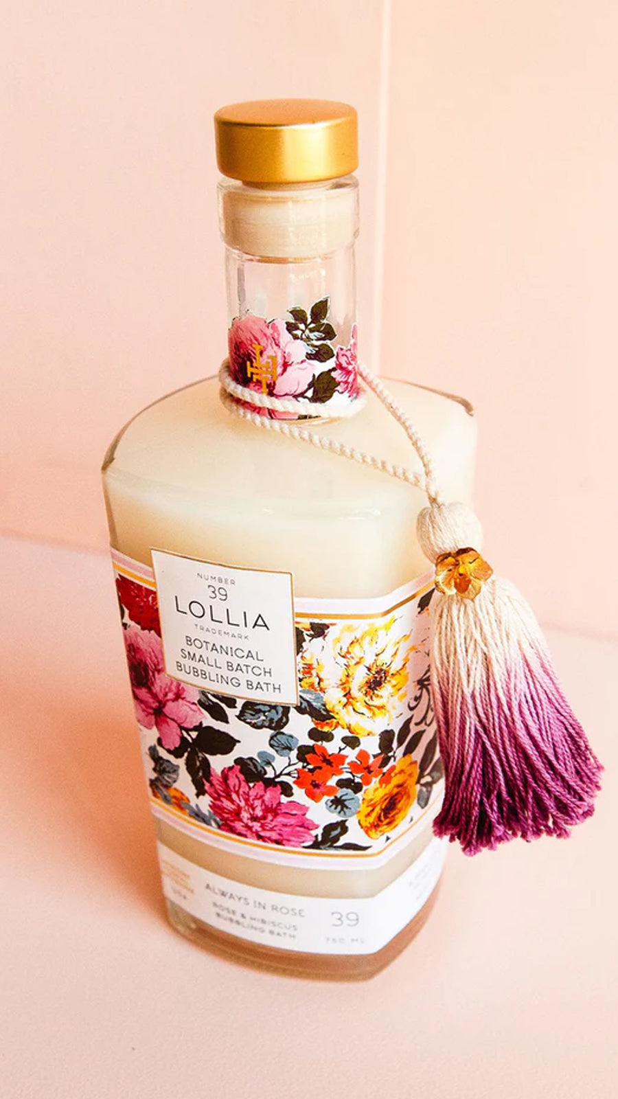 Bring a modern sophistication to your bath with this striking glass bottle enveloped in sumptuous blooms. Set off by clean lines and accents of gold, it’s sealed with a signature Lollia cork.