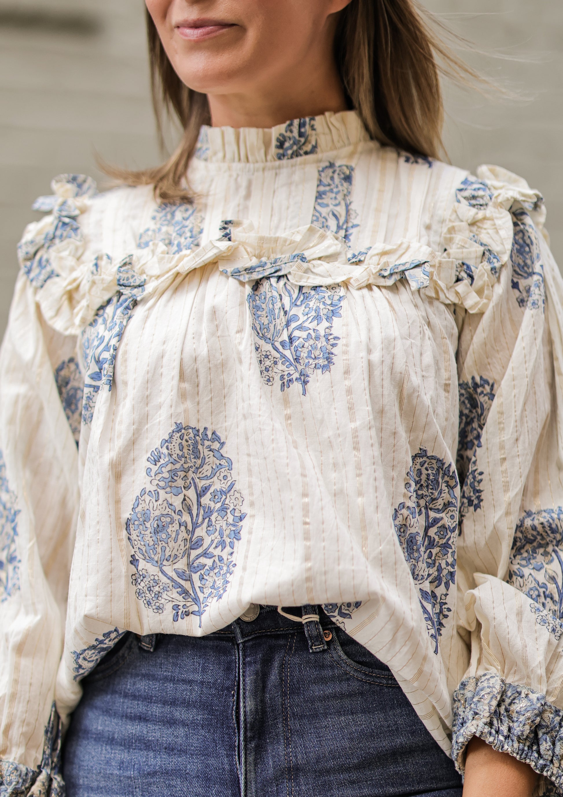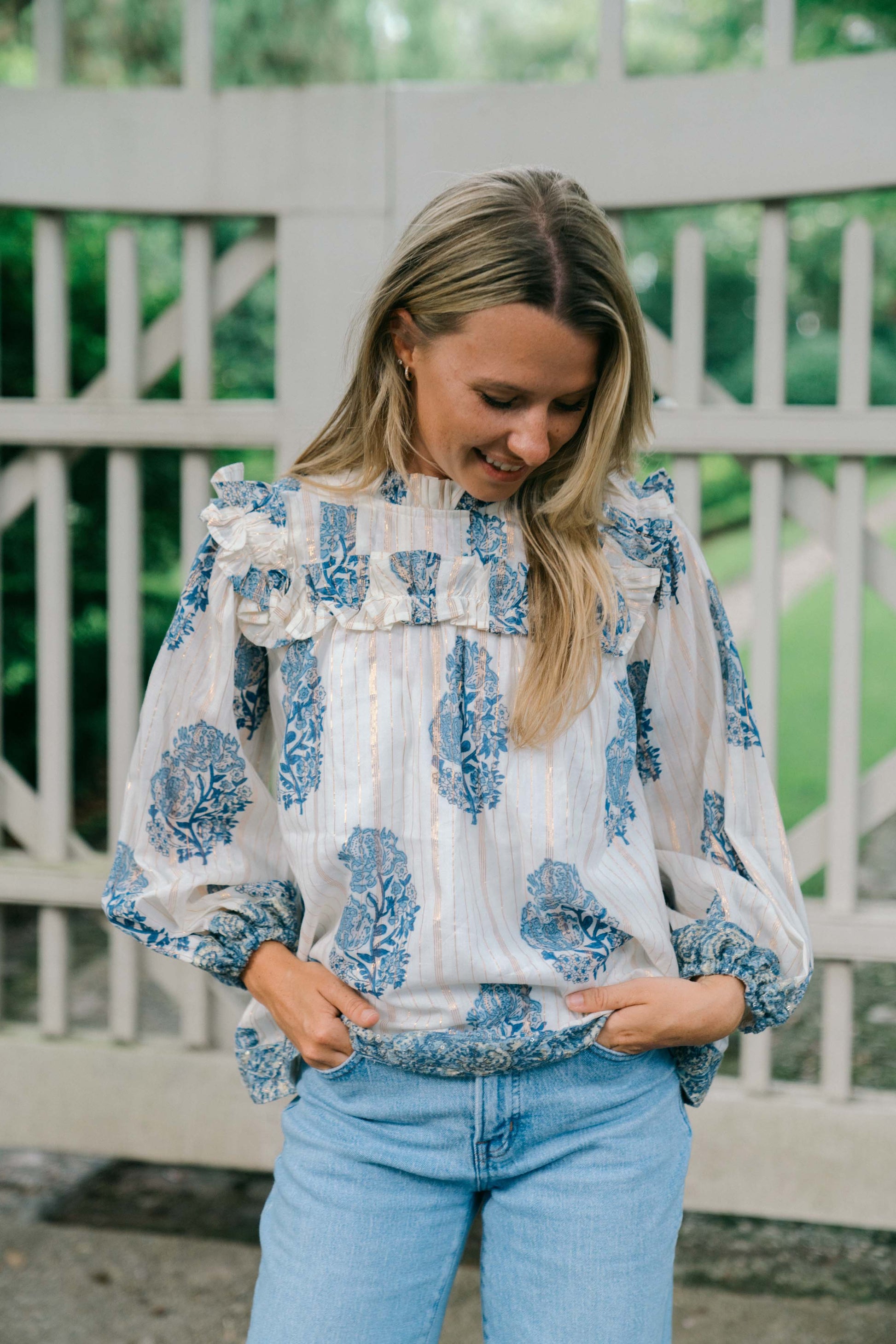 Experience effortless elegance with the Maple Blue Fern Top. Crafted from 100% cotton lurex and hand-blocked by skilled artisans in Jaipur, this blouse offers a relaxed fit enhanced by a delicate ruffle collar and graceful raglan sleeves. The elasticated sleeve openings ensure all-day comfort, while the keyhole detail at the back neckline adds a refined touch. Fully lined for a smooth feel, this top combines artisanal charm with sophisticated style, perfect for elevating your wardrobe with a unique, comfortable statement piece.