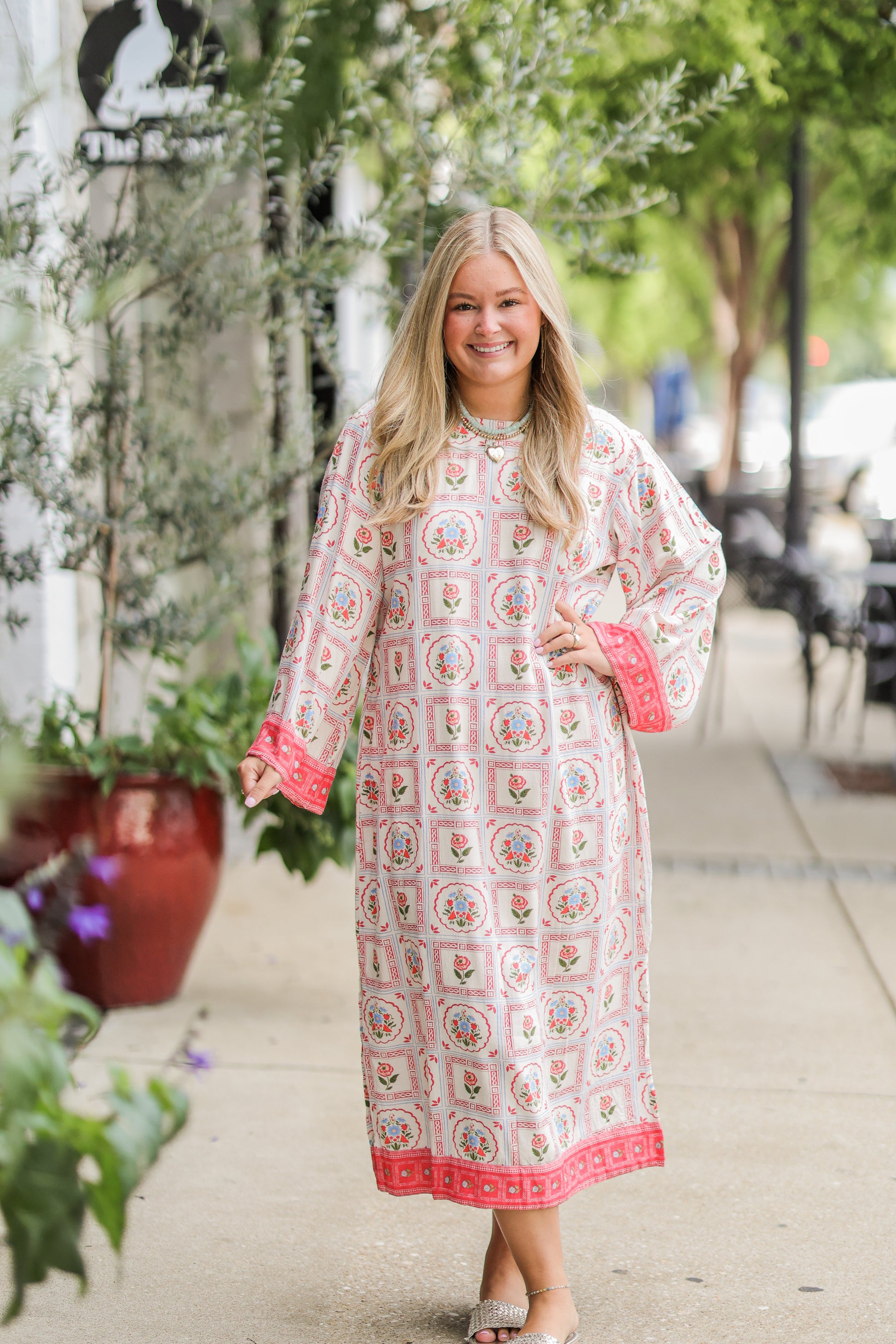 Embrace effortless elegance with the Milani Perennial Blooms Maxi. This caftan-style dress features vibrant poppy red and blue floral patterns that brighten any occasion. Its maxi length and wide bell sleeves offer a comfortable, flowing fit that moves gracefully with you. Perfect for warm days or relaxed evenings, this dress combines style and ease to support your confidence and comfort all day long.