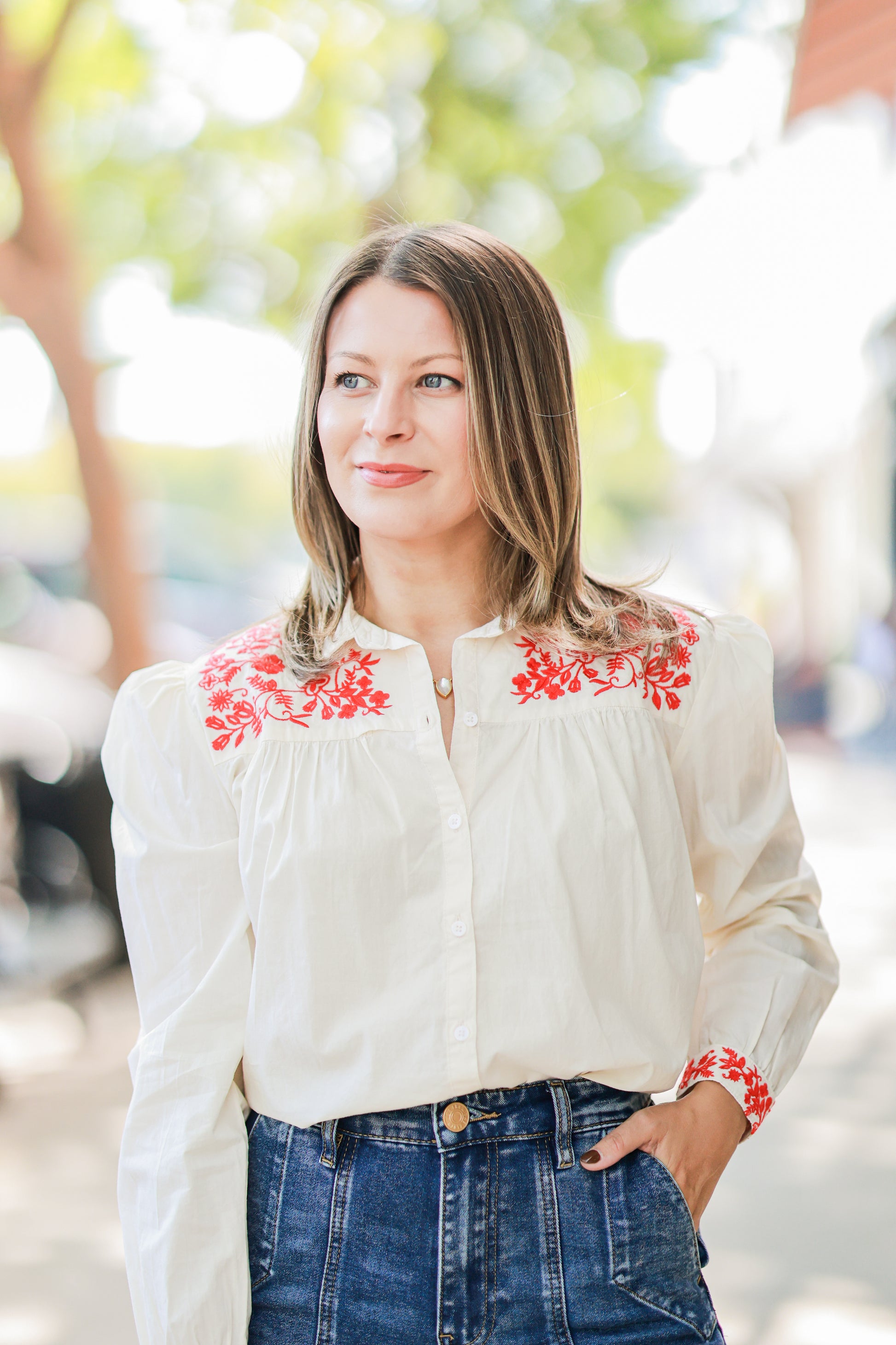 The Nasrin Whitecap Top is your go-to lightweight layer for fall! Made from 100% cotton in a soft cream base, it features bright red embroidery that adds a fun pop of color. With long sleeves and breathable fabric, this top keeps you comfy without feeling heavy—perfect for those crisp autumn days. Add a cheerful twist to your seasonal wardrobe with this playful design!