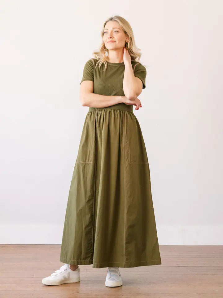 Effortlessly stylish and versatile, the Olive Noa Dress combines a ribbed knit top with a lightweight cotton skirt for a flattering, comfortable fit. Featuring oversized pockets and subtle contrast stitching, it’s perfect for casual days or weekend outings.