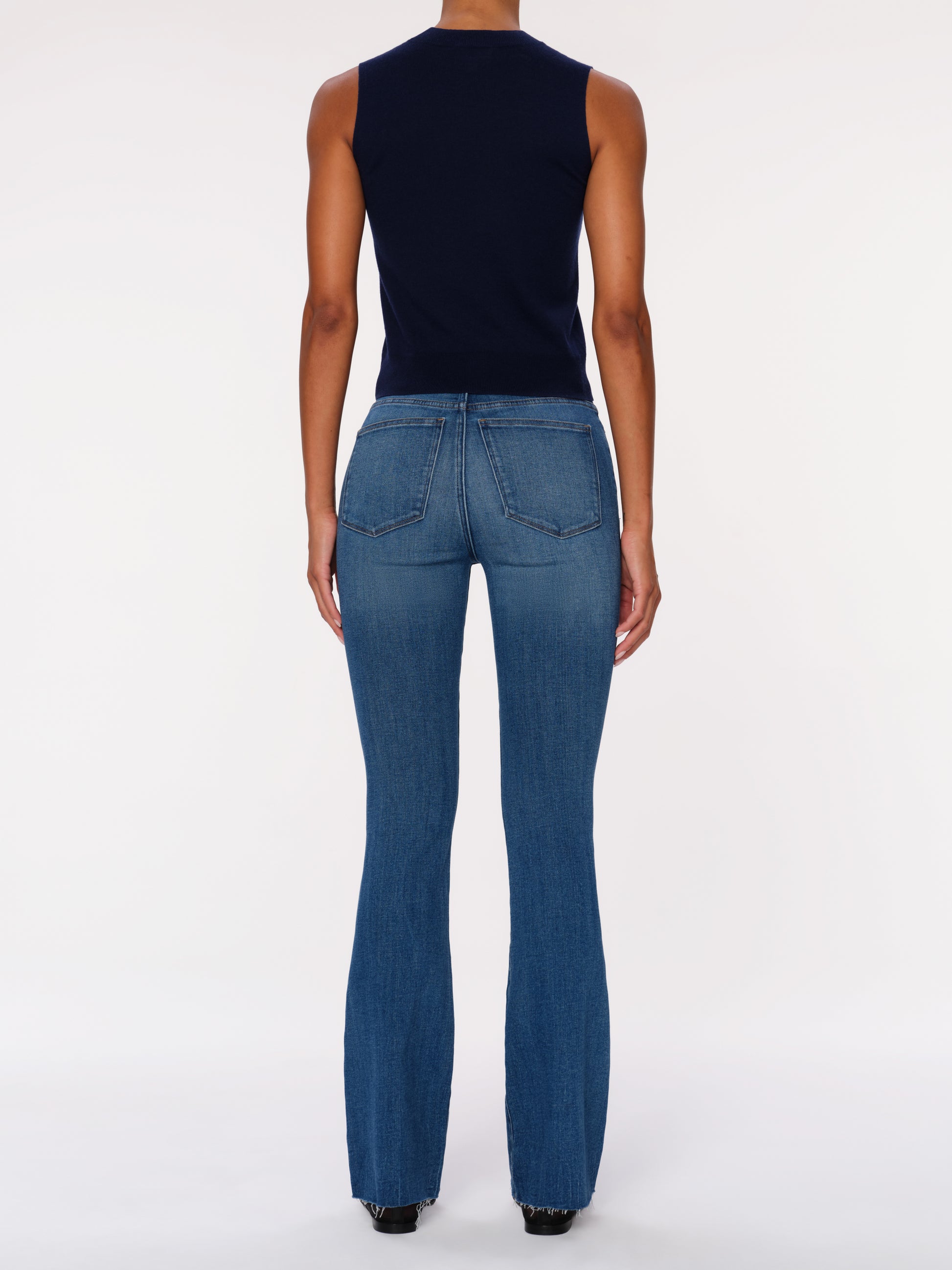 Bridget is a high-rise, boot cut fit with a 31.5' inseam that utilizes our Instasculpt™ technology to smooth, sculpt, and conform to your body for the perfect fit. Palm Springs is a bright, mid-indigo wash with subtle fading for a worn-in look. It features a silver shank, copper rivets, multi-colored stitching, a raw hem and an ecru back patch.