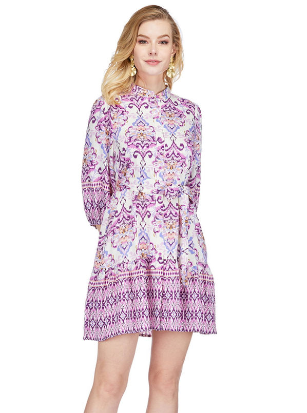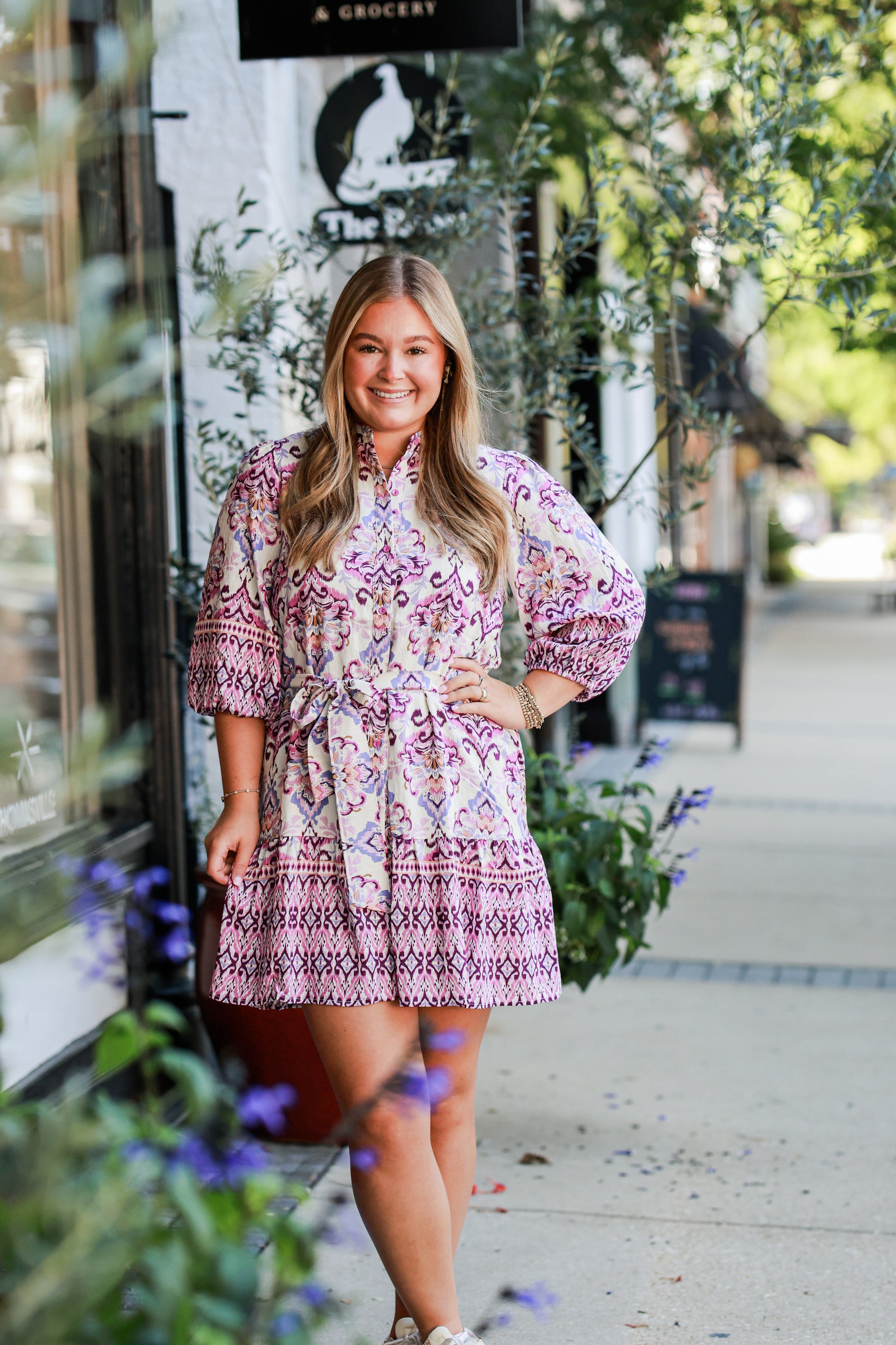 Step into charm with the Purple Iris Shirt Dress, featuring a silky, flowy fabric that moves with you. Its beautiful purple paisley print adds a touch of whimsy, making it perfect for a first day teaching or a bridal shower. Light, comfortable, and effortlessly stylish, this dress brings playful elegance to any occasion. Tie waist optional