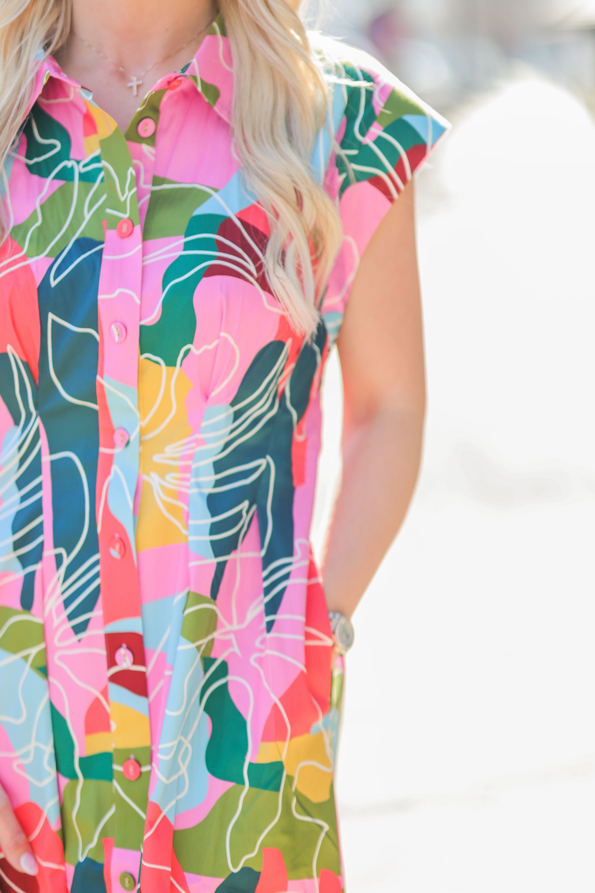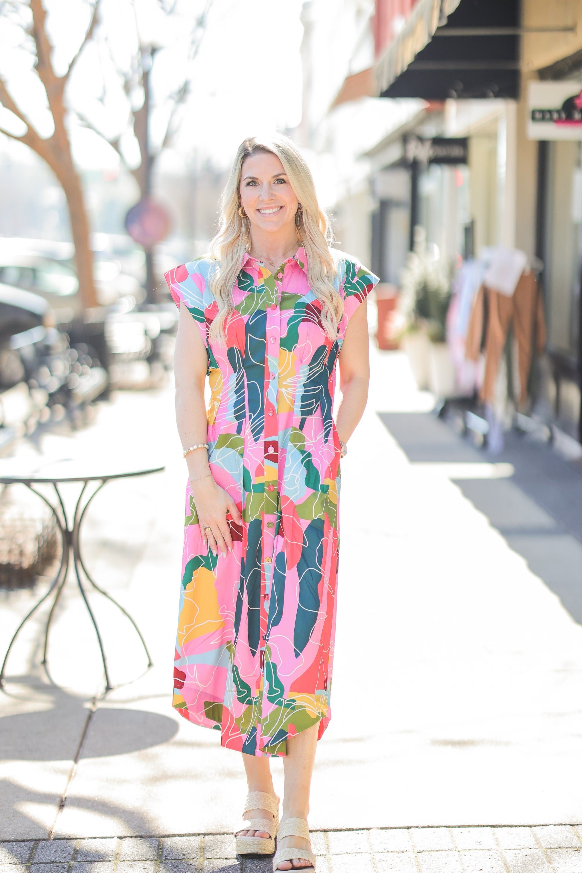 The Quincey Dress is one of Mollie’s Must-Haves for spring. This tailored midi features a button front, flattering slim-fit waist with pleat details, and pockets. Sleeveless and bra-friendly, it's the perfect dress.