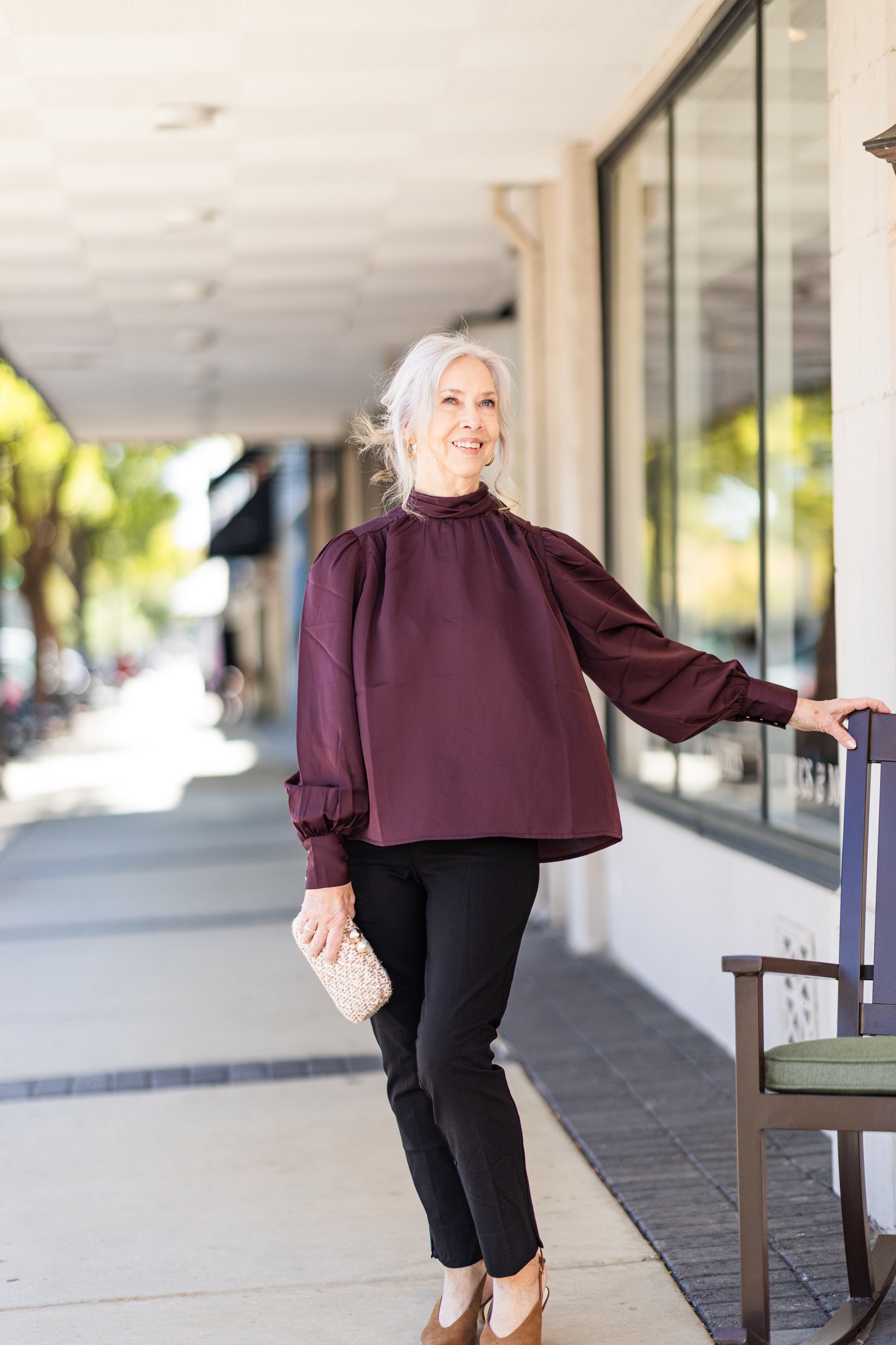 Slip into the Raisin Cosette Blouse and feel the silky smooth fabric hug your skin with a touch of luxury. Its high neckline adds a dash of elegance, while the tailored sleeves cinched at the wrists bring a flirty, polished vibe. Perfect for turning heads from brunch to boardroom with effortless charm.