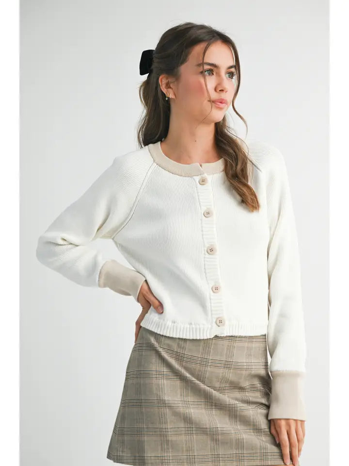 This relaxed REGINA cardigan is crafted from a soft cotton yarn with a cozy knit texture. She features a button-front closure and ribbed trim, offering a slouchy, relaxed fit. Highlights include a scoop neckline, contrast detailing on the neckline and cuffs, and a classic silhouette