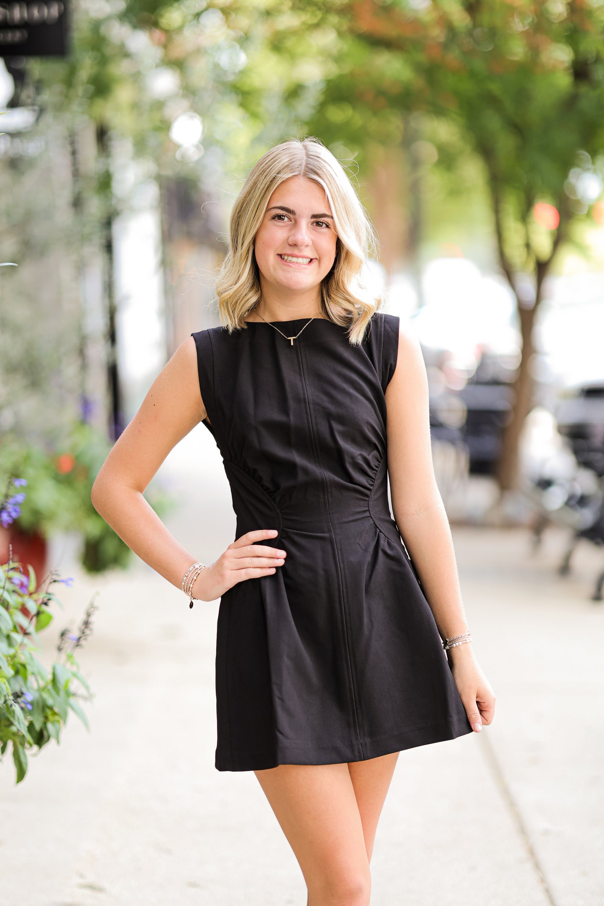 The Romy Mini Dress in classic black offers a refined silhouette with its high boat neckline and sleeveless design. Featuring subtle gathered detailing at the waist and a fitted bodice that gently flares into a mini skirt, this dress balances elegance and ease. An invisible back zip ensures a seamless finish, making it a versatile choice for both polished daytime looks and sophisticated evening wear.