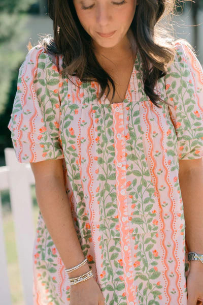 The Rose Garden Camille dress combines timeless elegance with artisanal craftsmanship. Featuring short puff sleeves and a flattering A-line silhouette, it offers a versatile look suitable for any occasion. Decorative buttons and contrasting panels enhance its refined design. Hand-crafted by skilled artisans in Jaipur, India, this dress is made from 100% cotton poplin, ensuring breathable comfort and lasting quality.