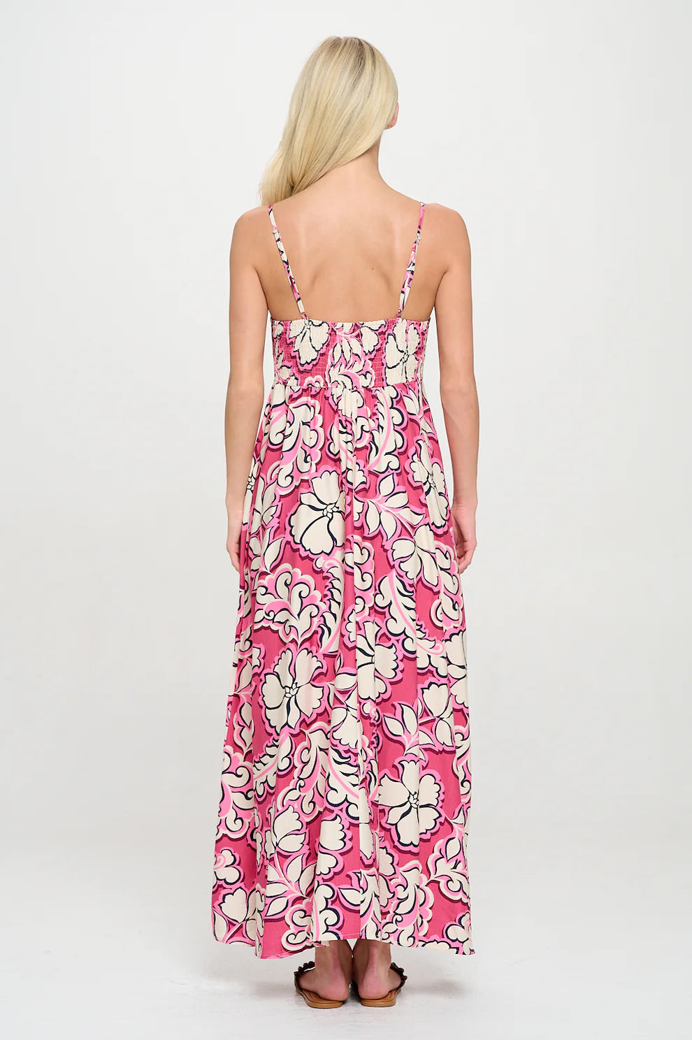 Turn every stroll into a statement in the Rosy Bloom Maxi Dress. Featuring a romantic floral print inspired by blooming island gardens, this breezy silhouette is tailored for sun-kissed escapes and resort evenings. The softly smocked bodice hugs comfortably before flowing into a relaxed, tiered skirt that moves with ease. Spaghetti straps and a flattering square neckline add a feminine finish. Style it with strappy sandals and gold jewelry for dinner al fresco or barefoot for beachside wanderings. Wherever you wear it, this dress captures the effortless elegance of a Mediterranean getaway.
