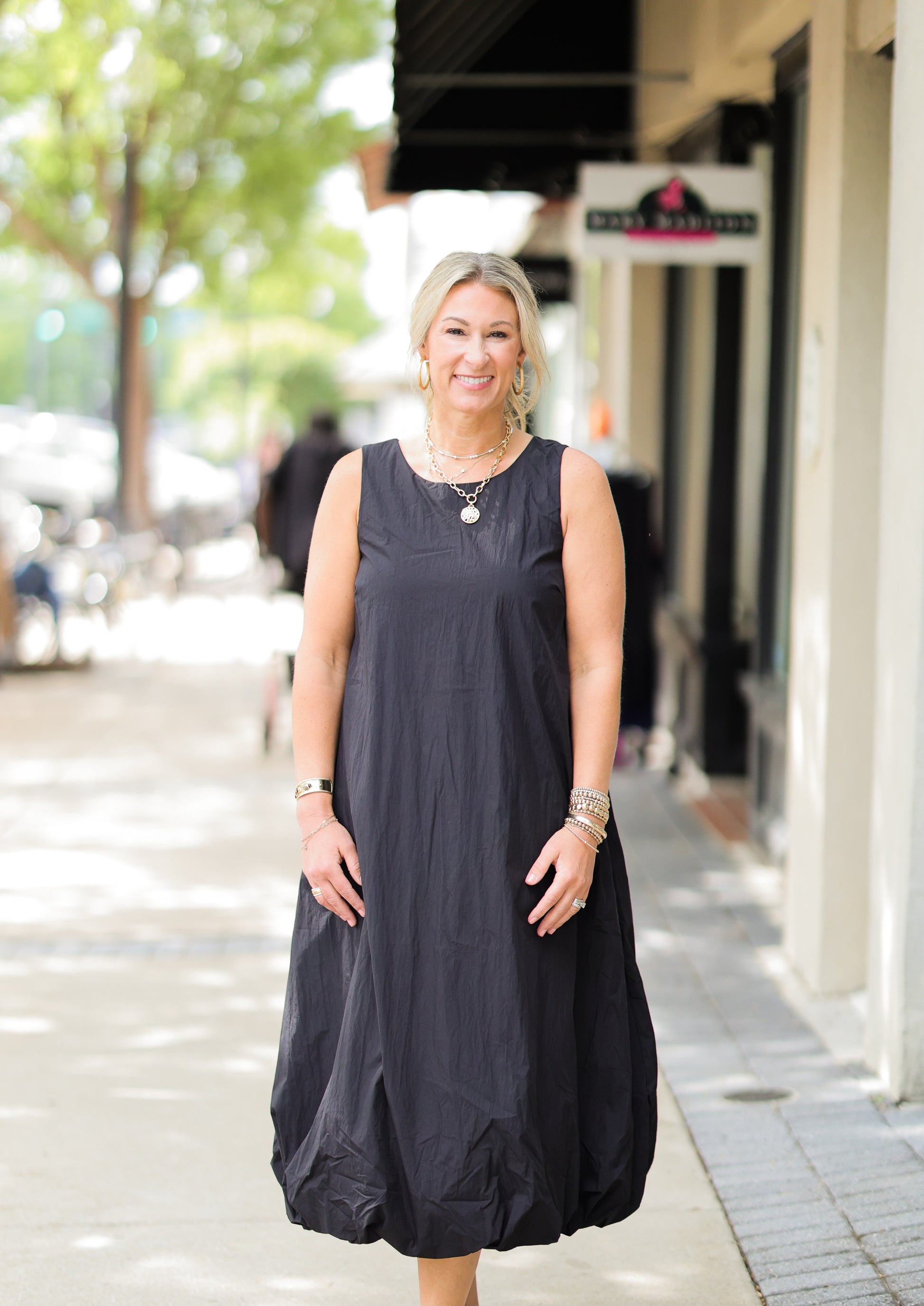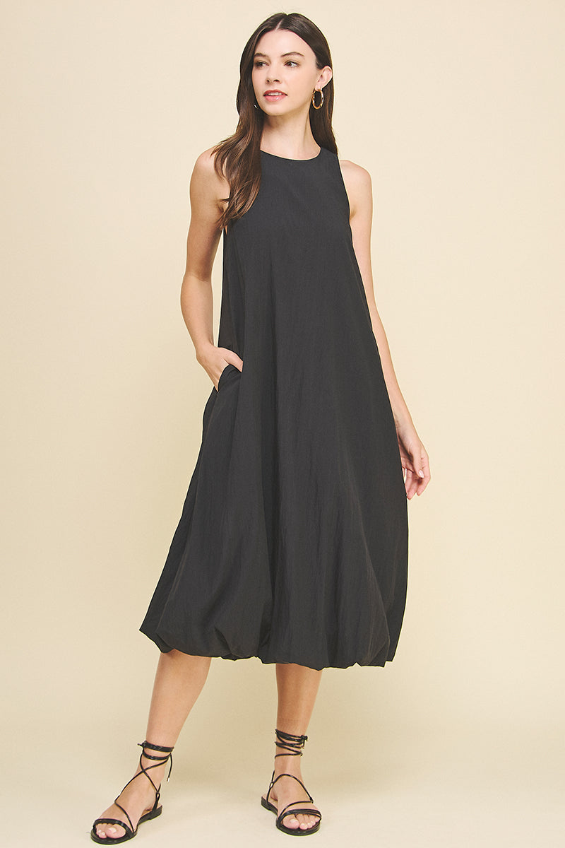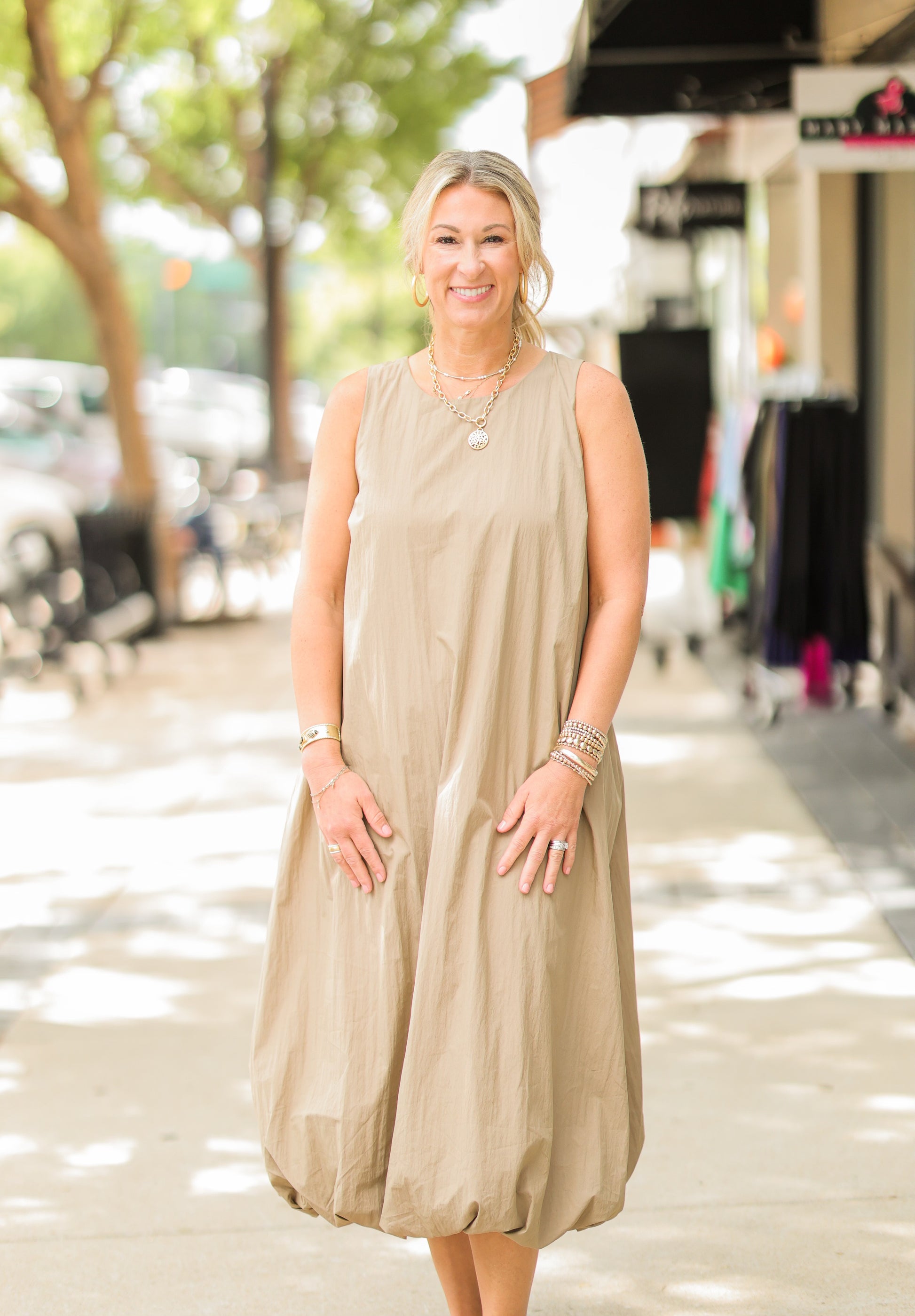 Step into effortless style with the SAC Polyanna Dress! This sleeveless, round-neck midi dress features a playful bubble hem and handy side pockets. Inspired by designer looks, its balloon bottom adds a fun twist perfect for any season. Easy to wear and easy to love, grab it in khaki or black and make your wardrobe pop!