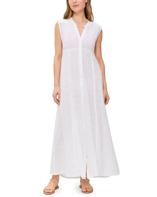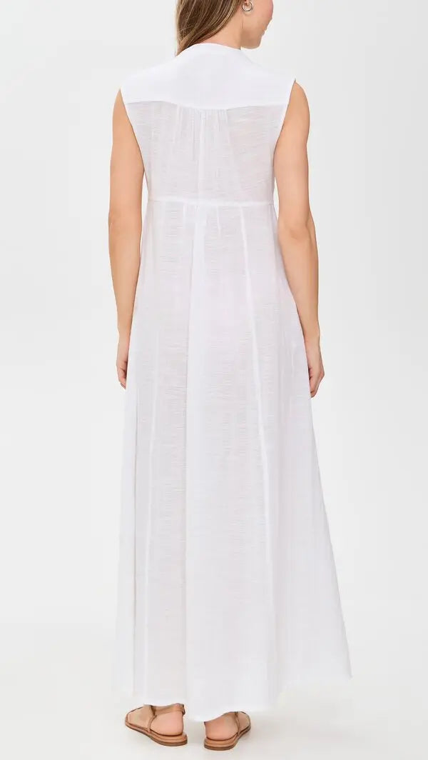 Introducing the luxurious SANDRA DRESS, made from lightweight, non-stretch slubbed weave fabric. A sophisticated midi length silhouette with a V neck, sleeveless design and elegant button placket. Crafted from 100% cotton and unlined, this dress is perfect for warm summer days. Exude elegance and style in this exclusive piece, washable and imported from India. Measurements from size XS: Length - 53.25in / 135.0cm, from shoulder. Available in classic white.