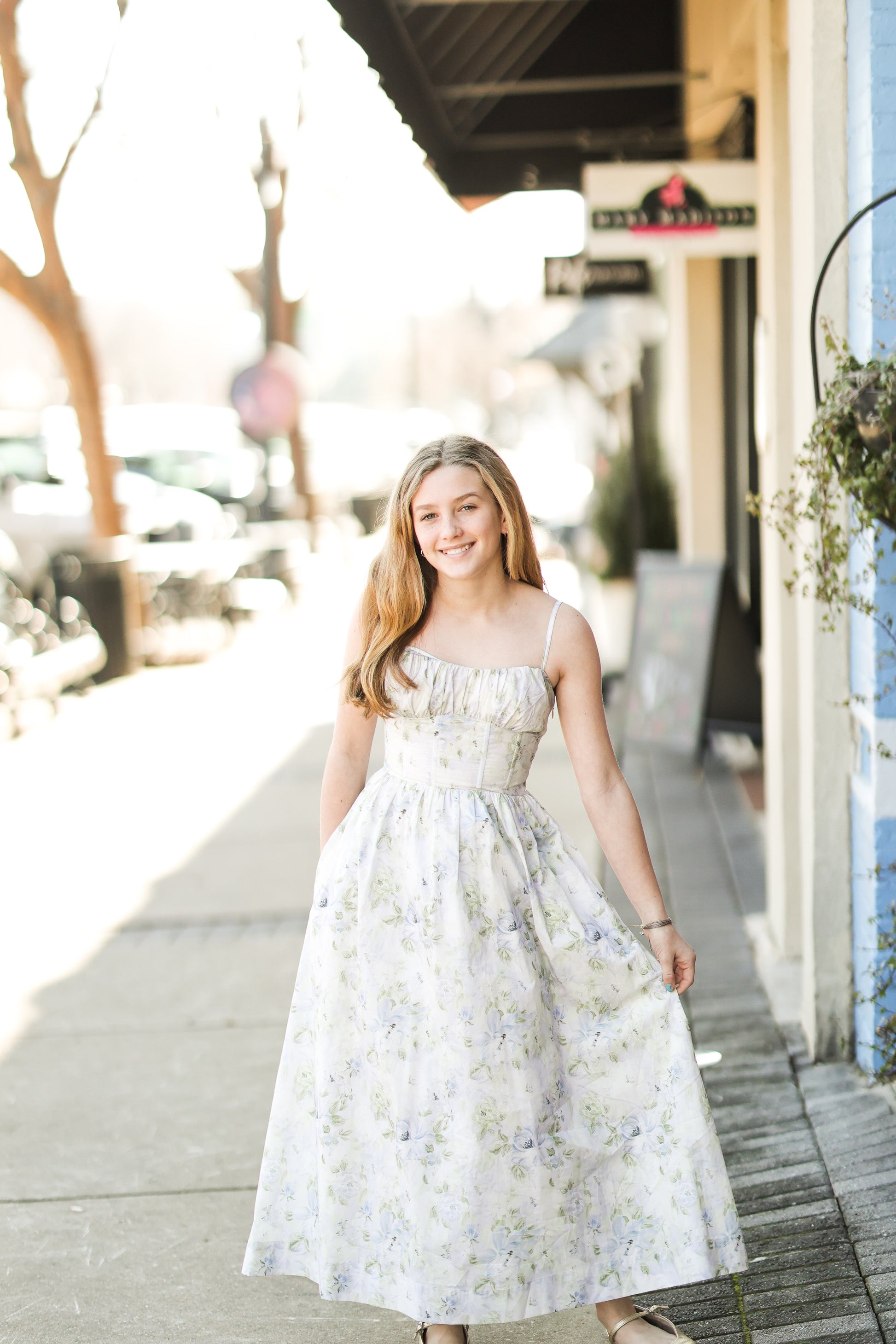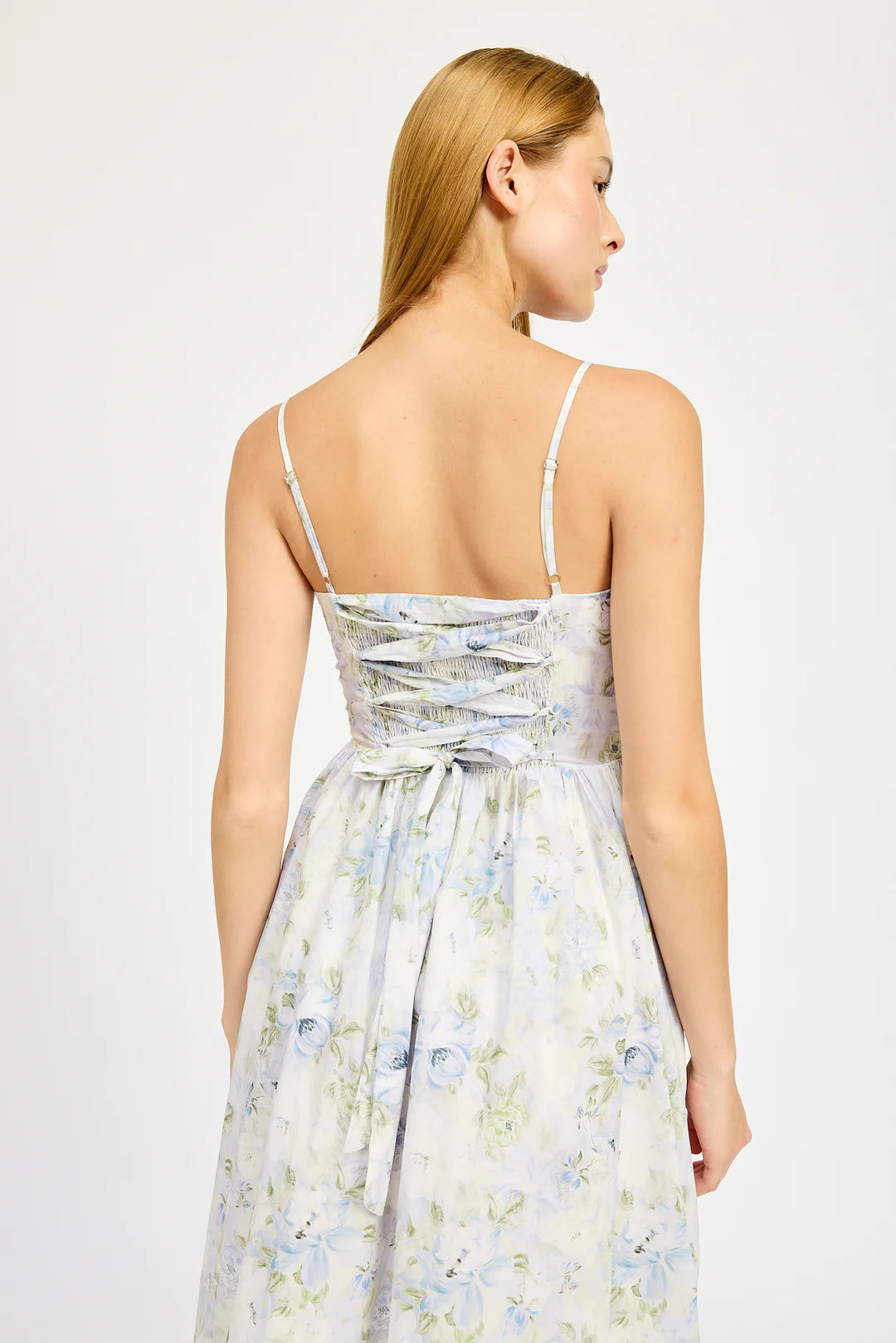 Made with 100% cotton and a 100% cotton lining, this Baby blue flower-printed midi dress features a sweet corset back for a touch of femininity. Hand wash and imported. Perfect for the sweet, girly dress you've been searching for.