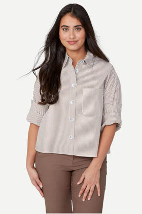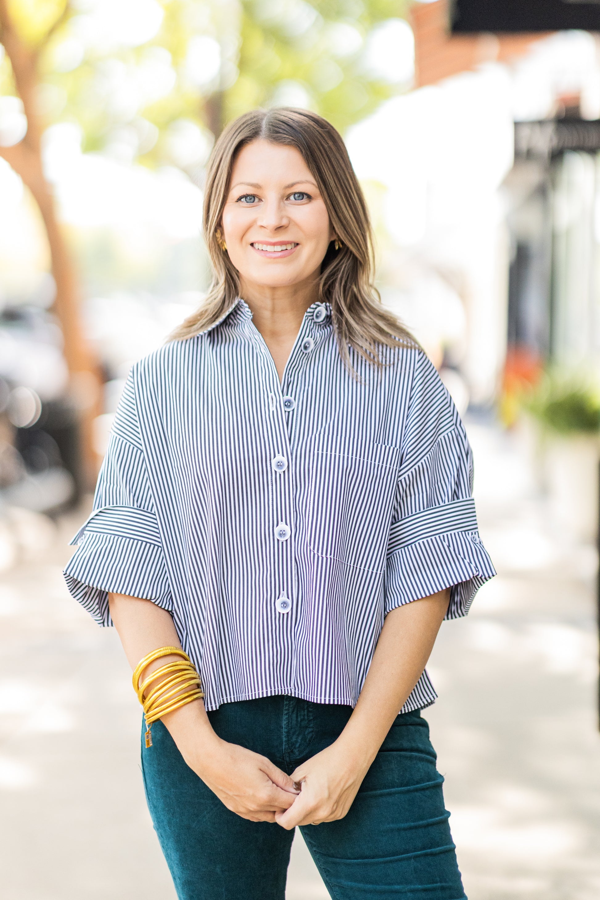 The Straight Shot Top features a boxy fit with tri-cuffed sleeves and glossy glazed buttons, making it your go-to piece to effortlessly dress up or down. Whether you’re aiming for chic casual or polished cool, this top has got you covered with a playful touch.