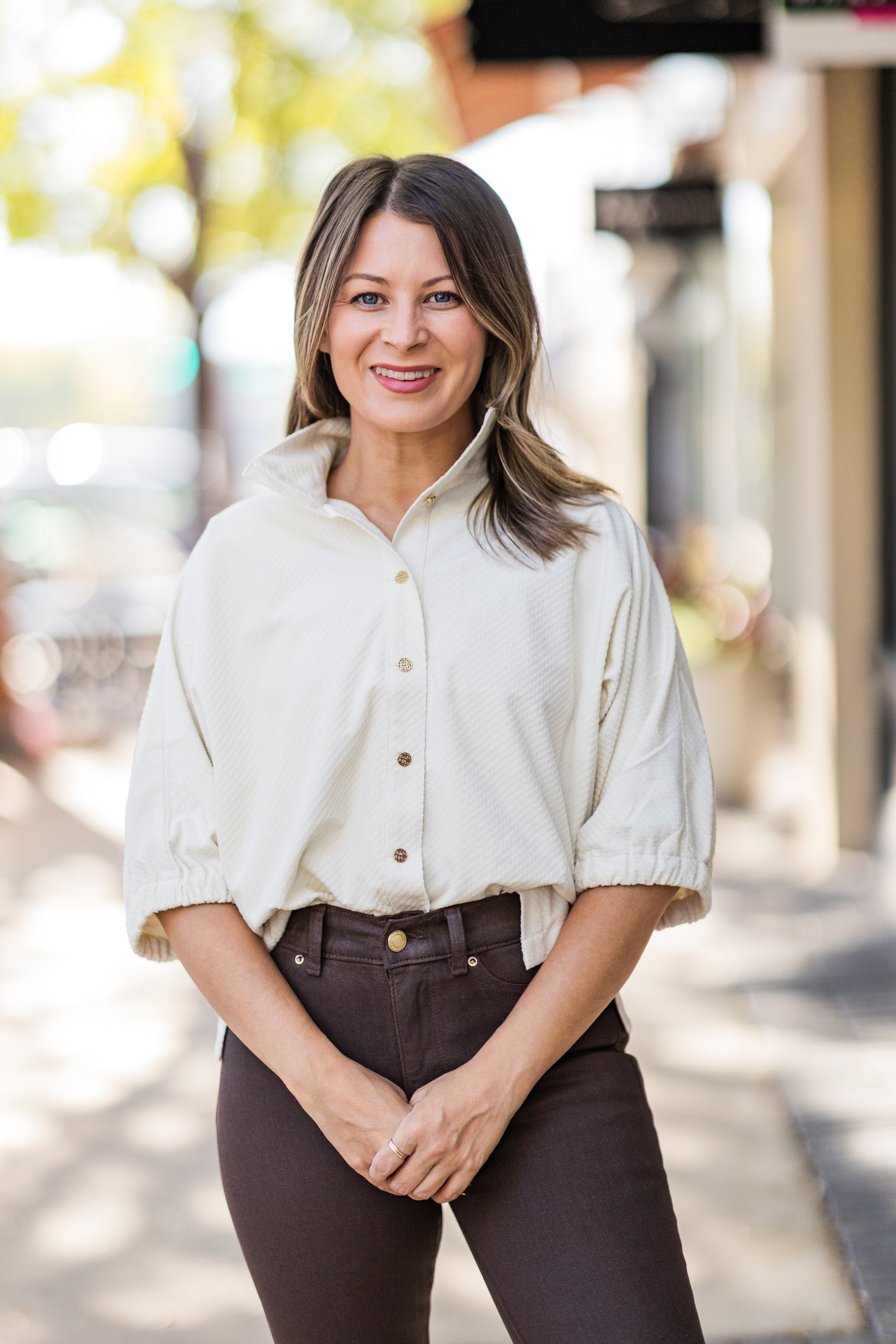 The Bonny Top puts a fun twist on the classic Poppy shape with plush velvet that adds rich texture and charm. Featuring a sharp stand collar and breezy elastic dolman sleeves, it’s comfy yet effortlessly chic. The front flaunts shiny gold buttons for a touch of sparkle, while the loose fit keeps things easygoing. Perfect for days when you want to feel polished without trying too hard. Care is a breeze — just a gentle cold wash and hang to dry.