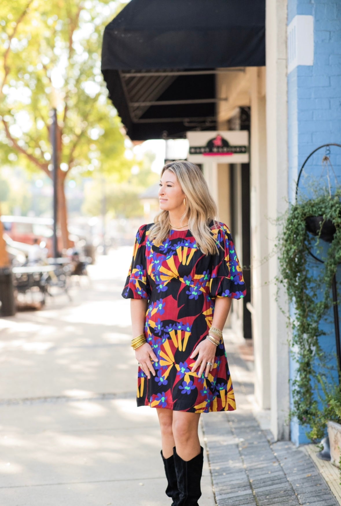 This WINTER CHLOE DRESS features a high neck and is made from soft polyester fabric. The black poplin, gold, and crimson purple colors of the COREY LYNN design add a touch of sophistication. Perfect for colder months, this dress offers comfort, style, and versatility.